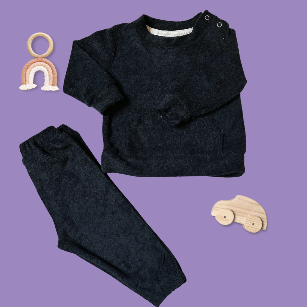 Diseño confeccionado en Towel super suave y comodo, tiene una cara lisa interna tipo jersey y una externa con una textura simil toalla, pero más delicada y suave. Este conjunto consta de un buzo canguro con capucha y dos broches para mejor acceso de la abeza del bebe, y un Pantalon del mismo tono, con puño con elastico, lo que le da un toque re canchero.