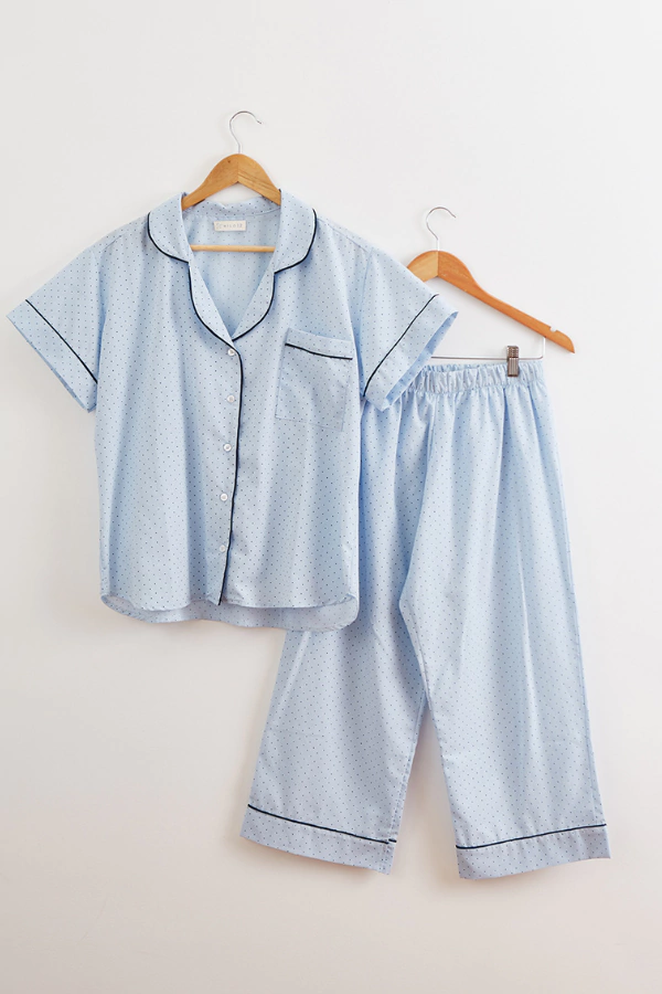 Conjunto Manu Pijama Celeste¡Set de pijama celeste con puntos azul marino es todo lo que necesitas para estar cómoda y con estilo! Confeccionado con tela de algodón, es perfecto para tus noches de descanso. El pantalón de tiro medio-alto con elástico en la cintura se adapta a tu cuerpo sin apretar, y la camisa de manga corta con cuello solapa y escote en V te hace lucir genial incluso en casa.Talles disponibles:S/M:PANTALON: Cintura: 35 CM más elástico - Largo: 80 CM - Cadera: 66 CM -CAMISA: LM: 16 CM - Sisa: 23 CM - Ancho busto: 57 CM.L/XL:PANTALON: Cintura: 38 CM más elástico - Largo: 80 CM - Cadera: 68 CM -CAMISA: LM: 16 CM - Sisa: 23 CM - Ancho busto: 60 CM.- Largo: 67 CM.*Nuestros talles son amplios y realesCuidado de la prenda: - Lavar con agua fría - Utilizar plancha tibia - NO utilizar secarropas - No retorcer - Usarlo con amorColores: Celeste - Off White