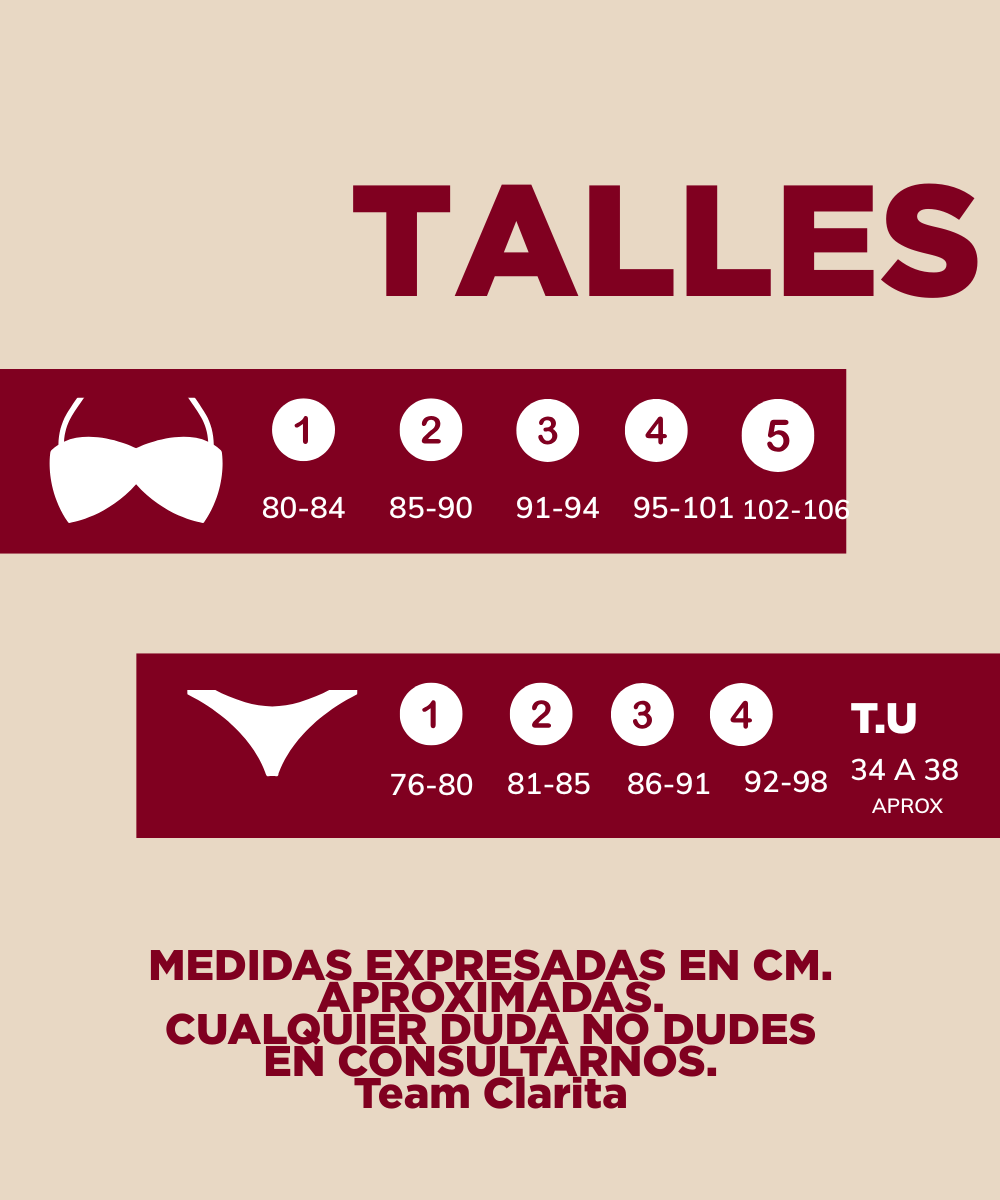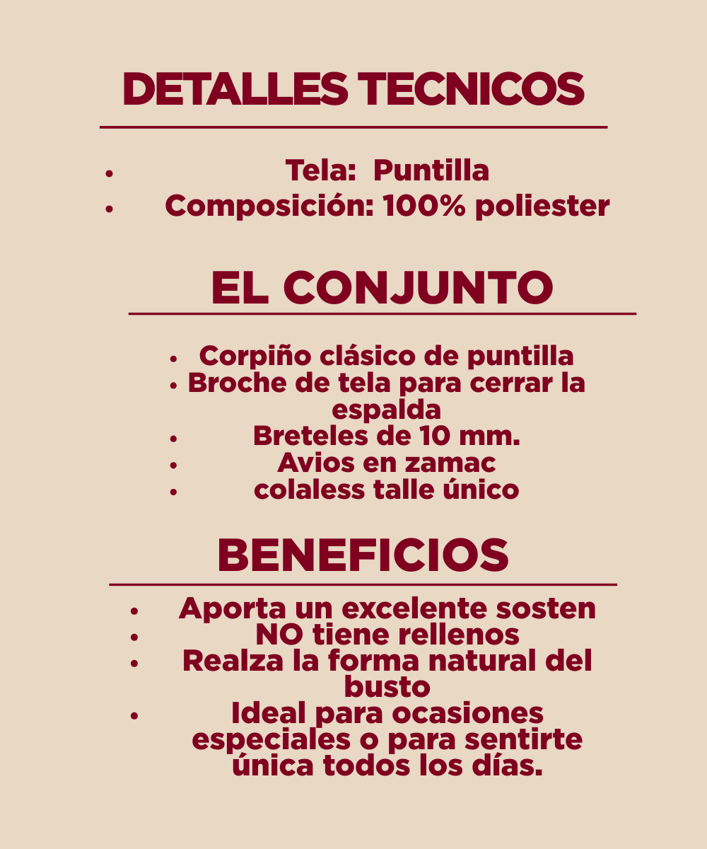 Conjunto de puntilla. Corpiño bralette de puntilla con coletas también en puntilla. Broche de tela para cerrar la espalda. Breteles regulables. Vedetina haciendo juego en la misma tela con un diseño distintivo.