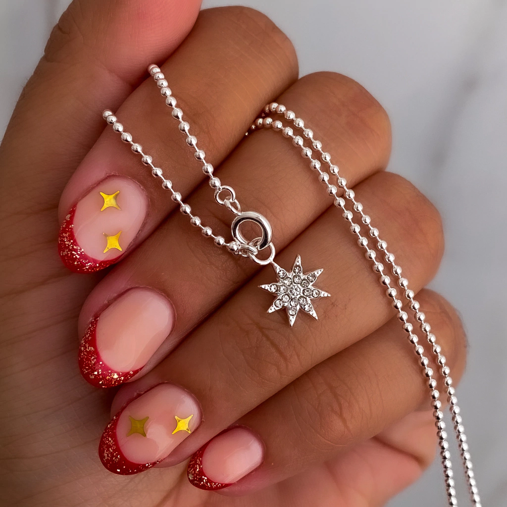 Conjunto cadena con bolitas y dije estrella terminada en brillantes, de acero blanco.Medidas aprox.: 50cm de largo total.