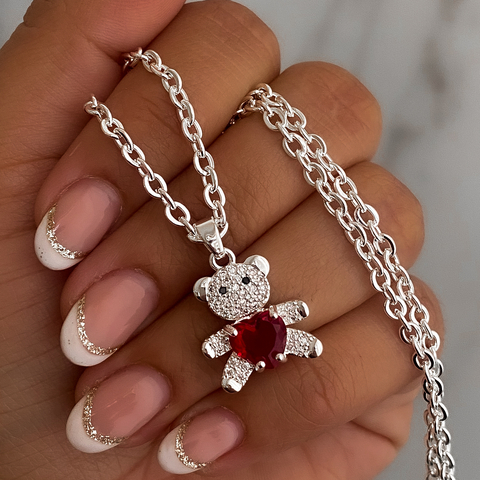 Conjunto cadena tiffany con dije osito corazón color rojo, terminado en mini brillantes, de acero blanco.Medidas aprox.: Largo regulable de 45 a 50cm.