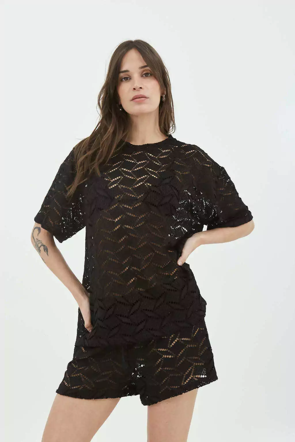 Conjunto VeranoConjunto de short y remerón manga corta calado. Ideal para estar cómodas en casa y también queda divino para usar afuera en días de verano. Es un conjunto cancherísimo para usar también sobre tus trajes de baño. Remerón básico de corte amplio con tajitos laterales, escote redondo y mangas caídas. Short con cintura con elástico y cordón de ajuste. Material: Crochet de poliéster. Es un tejido suave y fresco similar a un tejido de crochet.