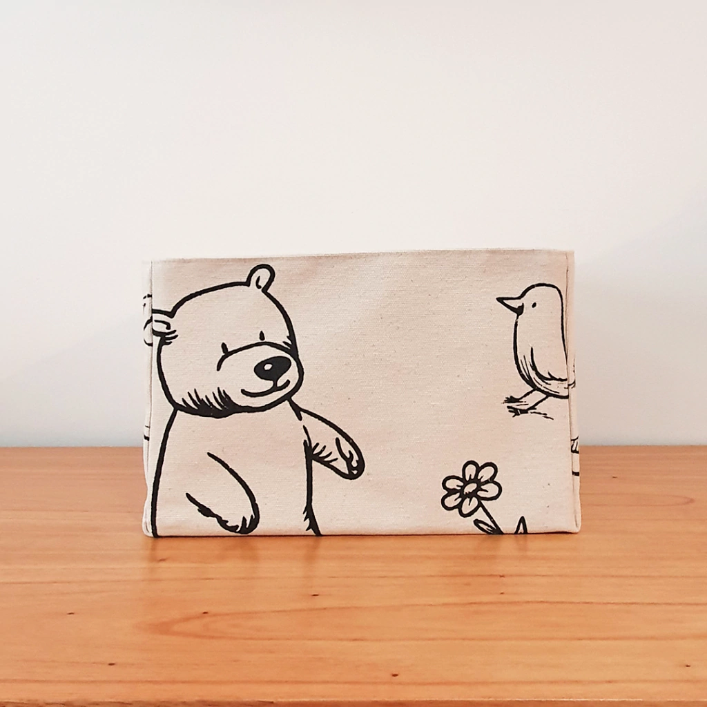 Confeccionado en doble tela (lona + forrería de lienzo natural 100% algodón), es resistente, liviano y fácil de trasladar. Su formato rectangular permite que se adapte perfectamente a estantes, repisas o a cualquiera de nuestros muebles jugueteros.