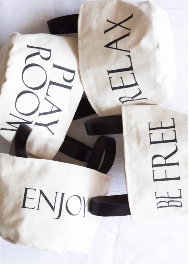 Contenedor confeccionado en lona gruesa 100% algodón color crudo intervenido en serigrafía en color negro.Interior forrado. Asas de cuero.Medidas: 15 cm. de diámetro x 13 cm. de alto.