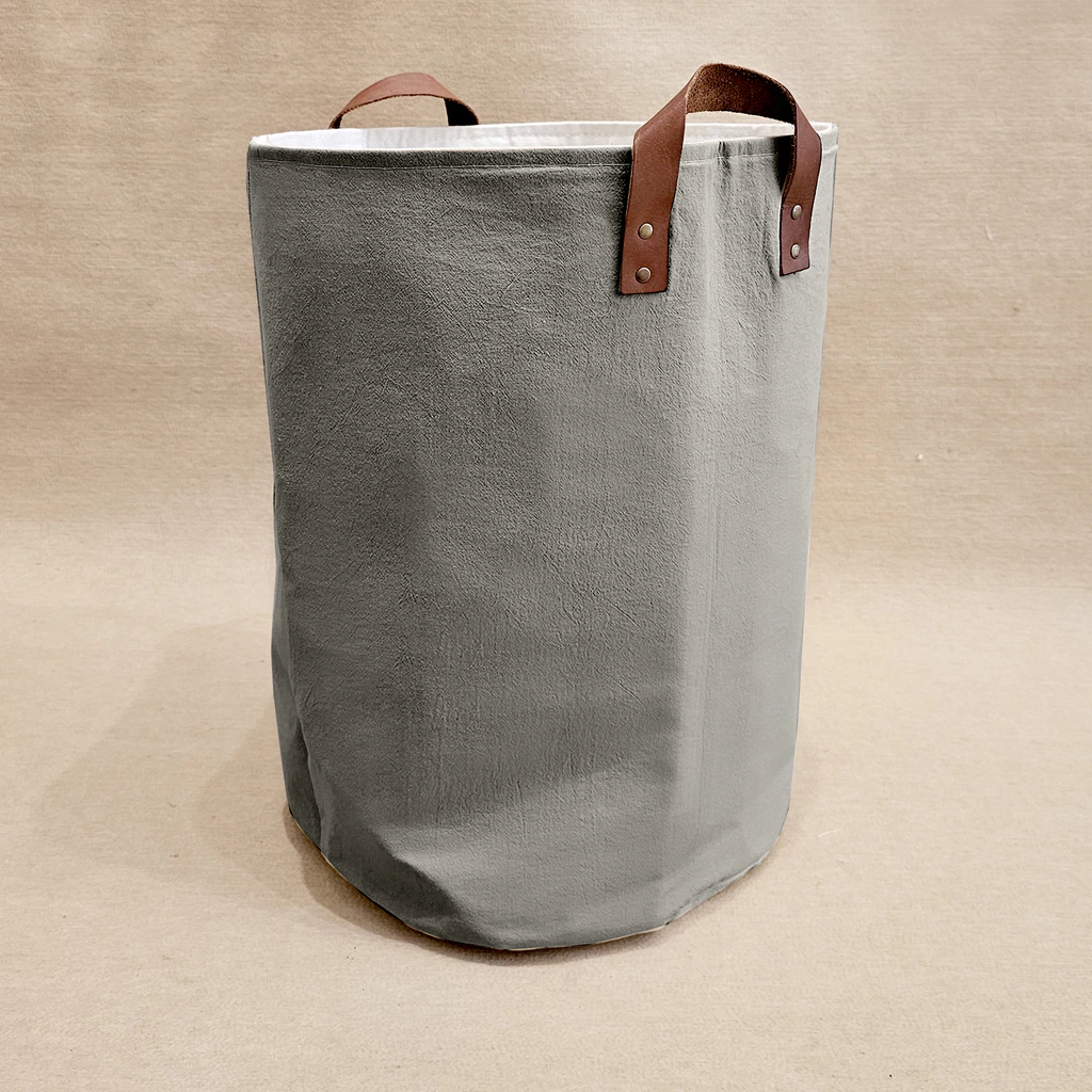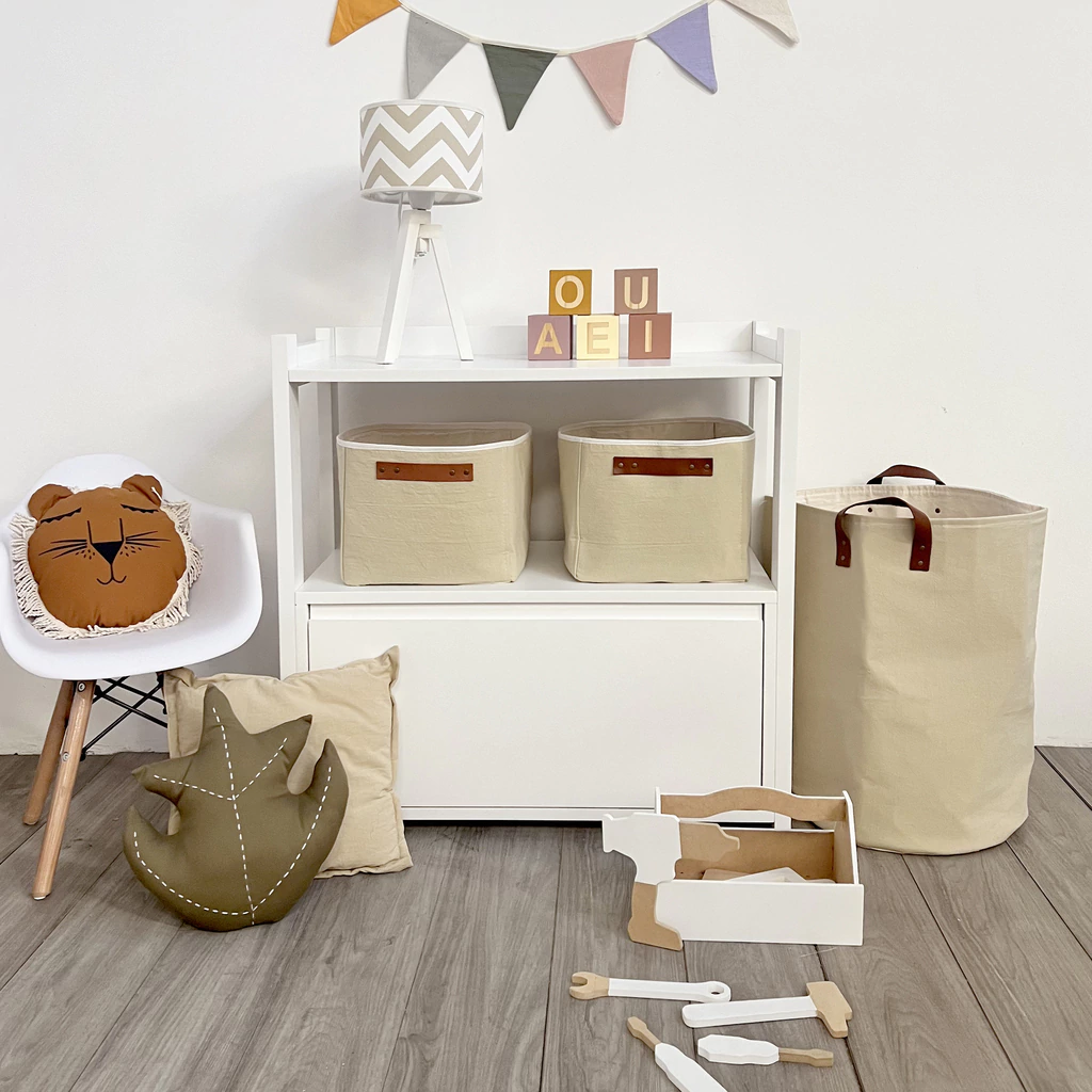 El contenedor está diseñado para ofrecer una solución práctica de almacenamiento, ayudando a mantener el orden. Fabricado en algodón tusor, este material es suave al tacto y resistente, ideal para el uso diario. Su tira de cuero natural proporciona durabilidad y un fácil agarre al moverlo.