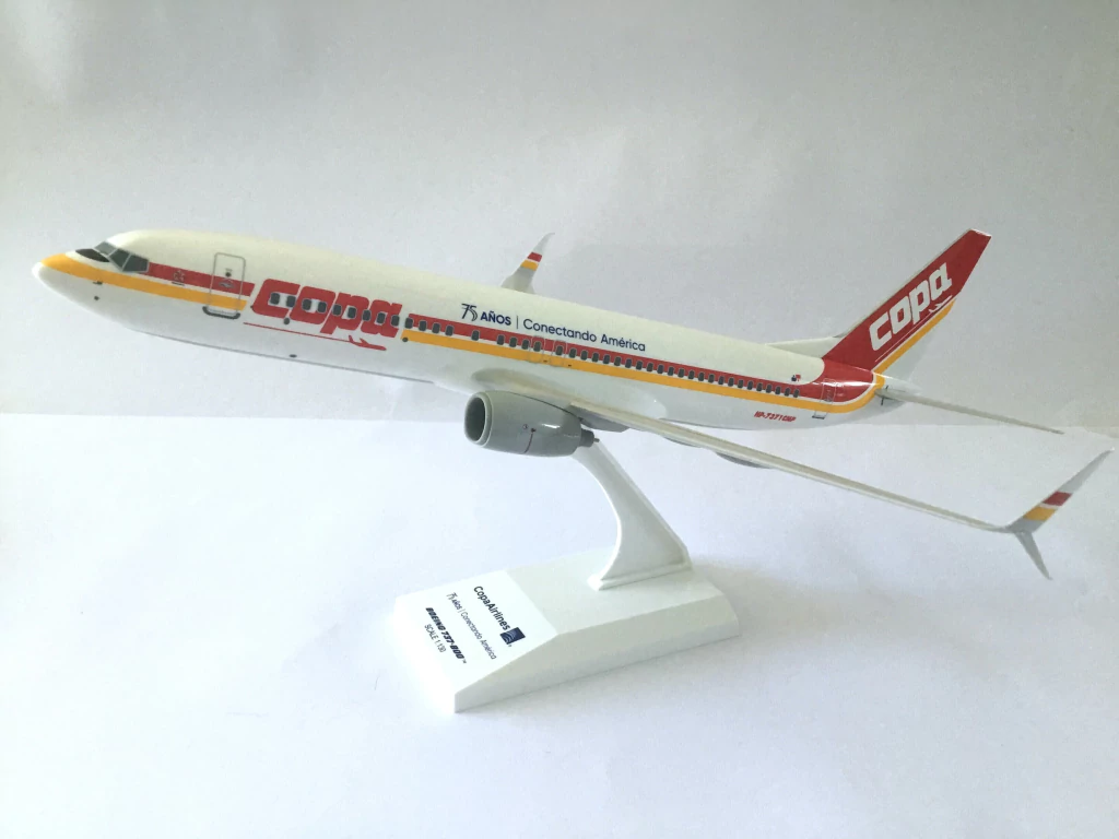 Avion: Boeing 737-800Compañía: CopaLivery: Retro (75 Años conectando America)Matricula: HP-7371CMPMarca: SkymarksLinea: SnapfitMaterial: Plastico InyectadoEscala: 1:130Largo de Fuselaje: 31 cmEnvergadura de Alas: 28.5 cmProducto ExclusivoSomos representantes oficiales de Skymarks para la Republica Argentina.Aviones a escala de modelismo estatico, replicas exactas nivel premium, de plastico inyectado, alguno de ellos con los detalles de las ruedas de caucho.IMPORTANTE: La garantia cubre daños de fabrica, todos los aviones son revisados exhaustivamente antes de ser publicados. Cuide su pieza!!, es un elemento de coleccion, no un juguete!!!!.Mantenga alejado de los niños, tiene elementos punzantes, apto +14