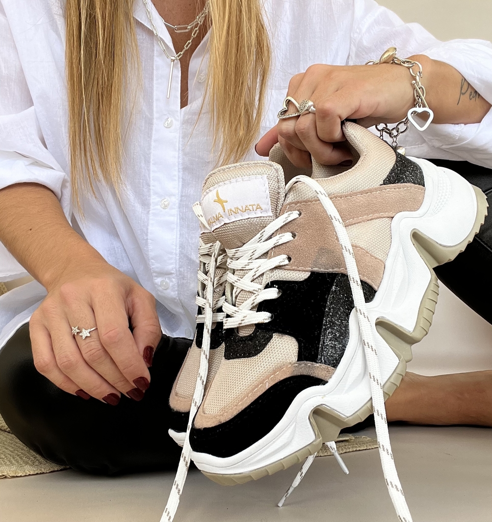 KALMA ESSENTIALS❤️Zapatillas de tela tejida y suela full expanso. Diseño urbano😍Altura talón:5 cm (alta)Plataforma (adelante):2,8 cmHorma:Normal.Diseño:Detalles en ecogamuza beige y negra & Brillo negro.CUIDADOS:No rozar ni raspar para no dañar su material. Limpiar manualmente