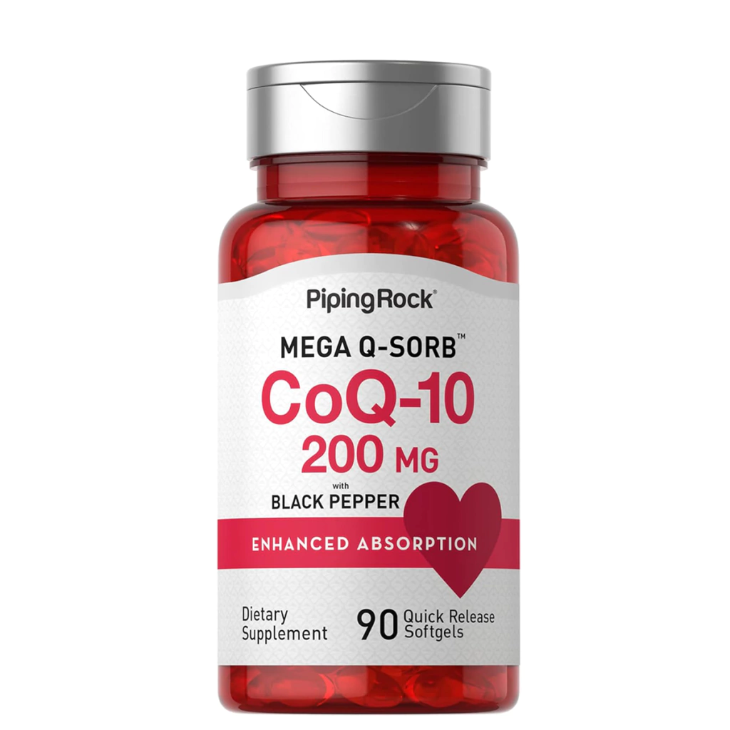 Piping Rock CoQ10 - Cápsulas blandas de 200 mg | 90 unidades | Absorción mejorada | con extracto de pimienta negra | Suplemento sin OMG, sin glutenCOQ-10 200MGAma tu corazónLa coenzima Q10 (CoQ10), o ubiquinona, es un nutriente natural similar a una vitamina que se encuentra en todo el cuerpo y se obtiene a través de alimentos integrales nutritivos. Actúa como un poderoso antioxidante que ofrece una amplia variedad de posibles beneficios. La evidencia sugiere que los niveles de CoQ10 disminuyen naturalmente con la edad. Un suplemento de calidad puede agregar un refuerzo adicional a su dieta diaria.Probamos nuestra fórmula de CoQ10 para garantizar la máxima pureza y potencia, a la par de nuestros estándares de calidad superiores. ¡Ama tu corazón, compra un frasco y recibe un suministro de 90 cápsulas blandas!La promesa de Piping Rock¡Estamos orgullosos de ofrecerle nuestra creciente selección de productos vitamínicos y suplementos diseñados para ayudarlo a alcanzar sus objetivos de bienestar al mejor precio de la industria! La belleza radica en la profundidad de nuestro surtido. Piping Rock ofrece cientos de productos únicos para hombres y mujeres de todas las edades. Nuestra selección avanzada incluye polvos, cápsulas blandas, líquidos y fórmulas orgánicas con ingredientes de primera calidad, provenientes de todo el mundo. Continuamente agregamos opciones sin OGM, veganas, orgánicas y sin gluten para satisfacer todas sus necesidades nutricionales. Nuestra sólida línea de productos evoluciona todos los días a medida que nos esforzamos constantemente por brindarle lo mejor.Acerca de la calidad de Piping RockEn Piping Rock ha encontrado su tienda única de vitaminas y suplementos. Nuestras fórmulas exclusivas se elaboran en nuestras propias instalaciones de fabricación con certificación GMP. Verificamos los productos de Piping Rock con agencias independientes registradas por la FDA para garantizar la calidad y la pureza. Cada producto pasa por cientos de controles, durante el proceso y en la posproducción. Además, podemos asegurarle que todo lo que figura en nuestra etiqueta es coherente con lo que contienen nuestras vitaminas y suplementos. Garantizamos pureza, potencia, seguridad e innovación en todo lo que hacemos.Sin glutenDios míoSin aromatizantes artificialesSin edulcorantes artificialesSin conservantesSin trigoSin levaduraSin lecheSin lactosa
