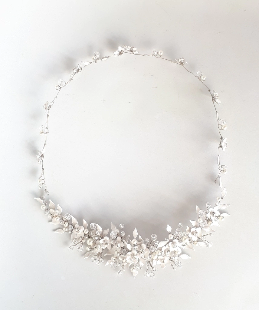 Corona irregular de cristales, flores de alpaca blanca y strass de cristal plata.