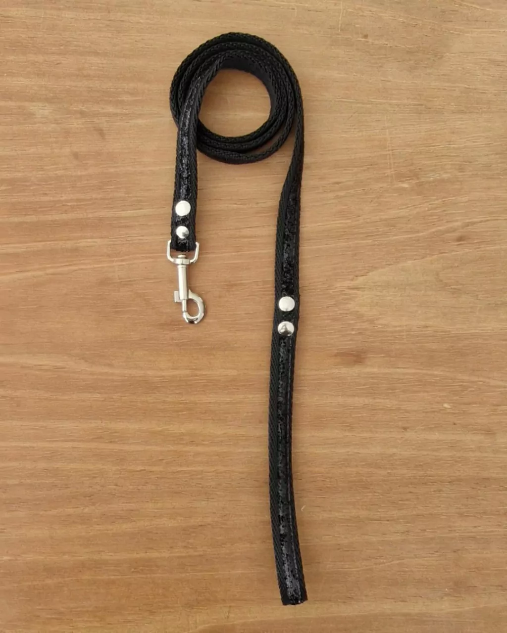 Correa de nylon negro con tira brillosa en el mismo tono.