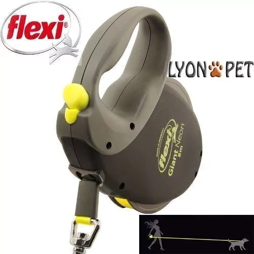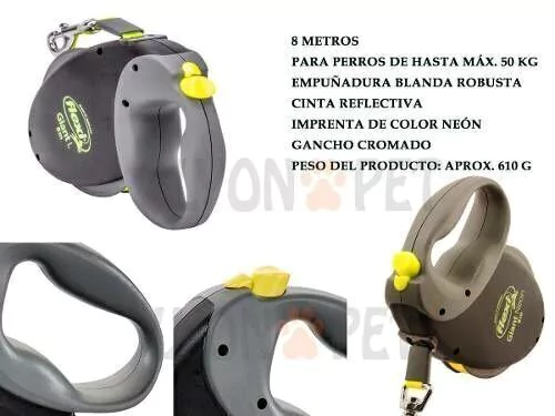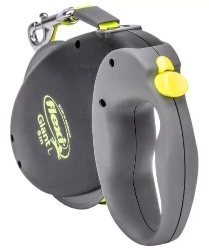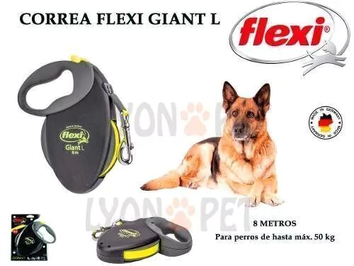 CORREA FLEXI GIANT L 8 METROS DE LARGO HASTA 50KG Las correas flexi se enrollan y desenrollan con gran suavidad, para que el perro pueda moverse libremente y que pueda estar bajo su control. Las correas flexi no quedan colgando, ya que el mecanismo interno de muelles de la correa mantiene la cinta o cordón con una ligera tensión. Con un sistema integrado de frenado y de recogimiento de la cinta o cordón con una sóla mano,el dueño siempre tendrá control sobre el movimiento de su perro. Al apretar el botón de frenado hacia abajo con el dedo pulgar y dirigiendo su mano hacia atrás, el dueño sera capaz de conducir a su perro cerca de si, para dirigirle con la correa corta. Al oprimir el botón de frenado y dirigir su pulgar hacia adelante podra activar el sistema de bloqueado permanente. Para desactivar este sistema basta con sólo deslizar su dedo pulgar hacia atrás. Ventajas flexi – la correa adecuada para perros 1. Libertad de movimiento = salud Recoger y extender hasta 8 m la correa sin que quede colgando. Las correas flexi ofrecen a todos los perros una gran libertad de movimiento a pesar de estar sujetos, y con ello favorece la salud y la alegría de vivir. 2. Control y seguridad Gracias a la correa de cordón o de cinta siempre ligeramente tensada y al sistema de frenado y recogida con una mano integrado flexi, el amo tendrá siempre a su perro bajo control. Por ello, el vínculo entre hombre y perro se convierte en un vínculo de seguridad. 3. Calidad Las correas flexi se fabrican en Alemania, cumpliendo los más altos estándares de calidad. Todas las correas se montan a mano, y antes de salir de fábrica deben pasar más de 90 controles de calidad. De este modo se consiguen los productos punta “Hechos en Alemania”.