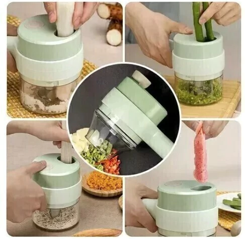 Cortador Triturador Vegetales Eléctrico Con Usb 4 En 1El Juego de Cortador de Verduras Eléctrico de Mano 4 en 1 es una solución versátil para la preparación de alimentos.Este juego incluye cuatro funciones esenciales:rebanar, cortar, pelar y un práctico cepillo de limpieza. Con esta única máquina, puedes disfrutar de las ventajas de un cortador de verduras eléctrico.Esto hace que la preparación de alimentos sea más sencilla y rápida. Además, su limpieza es igual de sencilla: basta con presionar una tecla y enjuagar la máquina, incluso puedes agregar agua al puerto de alimentación para una limpieza rápida en solo 5 segundos.IMPORTANTE: NO USAR MAS DE 30 seg continuos, deje reposar y siga usando otros 30 SegCaracterísticas Principales:Material de alta calidad:Fabricado con ABS, PP, PC y acero inoxidable de alta calidad, este juego es ligero y duradero. Las cuchillas de acero inoxidable y el borde dentado permiten un corte delicado de los ingredientes, lo que garantiza comidas saludables y seguras.Procesamiento sin precorte:La cortadora de verduras portátil cuenta con un orificio de llenado redondo que permite procesar alimentos enteros sin necesidad de pre-cortar. Ingredientes largos como morrones, apio, perejil, ajos, zuquinis, pepinos, entre otros, se pueden insertar directamente. Esto elimina los pasos tediosos de abrir y girar la tapaSeguridad en el picado de alimentos: El picador multifuncional es cómodo de sostener y presenta un diseño ergonómico que evita que tus dedos entren en contacto con las cuchillas al cortar. Olvídate de las habilidades de corte, ya que este diseño te permite picar cebollas sin derramar lágrimas.FICHA TÉCNICA:Material:ABS, PP, PC, acero inoxidable.Funciones:Rebanar, cocinar, pelar, picar.Limpieza:Fácil limpieza con una sola tecla y enjuague.Este juego de cortador de verduras eléctrico de mano 4 en 1 es versátil y conveniente. Puedes usarlo para moler suplementos, ajo, pimientos, cebollas, zanahorias y más. Su diseño ligero y elegante lo hace perfecto para viajes, cenas al aire libre, campamentos y otras actividades al aire libre. ¡Hace que la preparación de alimentos sea más eficiente y divertida!