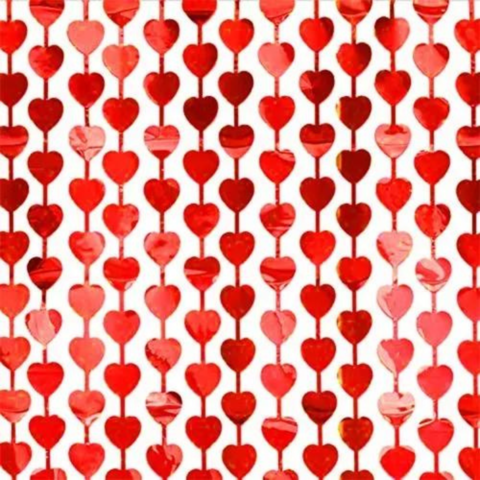 Cortina metalizada de corazones rojos¡Ideal para decorar todo tipo de ocasión!Medidas: 1Mts x 2Mts.
