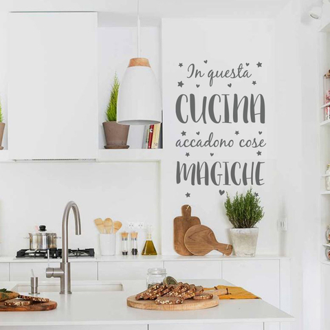 "In questa cucina accadono Cose Magiche"Los vinilos decorativos Looma son ideales para cambiarle la onda a las paredes del dormitorio, cocina, baño o cualquier rincón de tu casa de forma rápida y económica. Su colocación es muy fácil y te permite darle a tu hogar un toque único y original.Si no estás seguro de si pega en una superficie determinada, podés solicitarnos una muestra para probar.Material:Lámina fina de PVC (plástico) importado de primera calidad con adhesivo. El grosor del vinilo es menor a 1mm, lo que hace que parezca que está pintado sobre la pared. Pero también hay que tener en cuenta que, al ser tan finito, toma la forma de la superficie donde se pegan.Limpieza:Se pueden limpiar con un trapo húmedo con detergente o jabón blanco, no utilizar solventes, cloro, alcohol o productos abrasivos.No adhieren sobre:Pintura ultra lavable o Epoxi ni sobre superficies porosas, pastina o cerámicos encerados. Tampoco sobre paredes con humedad, descascaradas o texturadas. Sobre paredes recién pintadas, recomendamos esperar entre 10 a 15 días antes de colocar los vinilos.Colocación:cada pedido incluye un instructivo de colocación paso a paso. Se pueden pegar sobre casi cualquier superficie mientras que la misma sea lisa, esté limpia, libre de polvo y sin humedad. Son resistentes al calor de la cocina, pero se dañan si se exponen a llama directa. Se pueden mojar, son resistentes al vapor y al agua.Tiempo de Producción:Todos los pedidos los realizamos exclusivamente para cada cliente de acuerdo a la medida y diseño elegido. El tiempo estimado de producción para tenerlos listos en nuestro taller es entre 3 a 6 días hábiles, que se deben sumar al tiempo de envío en caso de elegir mensajería low cost o el servicio de Correo.Variaciones de Color:Las imágenes y los colores de las fotos de nuestra tienda online pueden variar de los tonos reales del vinilo. Las fotos son ilustrativas y los diseños impresos pueden tener una leve diferencia con las mismas. Por esto, te recomendamos que si no estás convencido del color, antes de comprar, nos solicites una muestra. Los pedidos impresos en distintos días pueden tener variaciones de color debido a que corresponden a distintas tandas de impresión. Sólo podemos asegurar el mismo color en las partidas que se imprimen juntas. Ante la duda, siempre calcula un poquito de más.Para tener en cuenta:El enrollado de los vinilos para embalarlos en los tubos puede generar algunas arrugas en el papel transfer que sirve para facilitar su colocación. Cuando recibas tu paquete, te recomendamos extender los vinilos sobre una superficie lisa y, en el caso de que lleven papel transfer, presionar de nuevo con una espátula o similar antes de su aplicación. El vinilo es un material flexible y por ello cualquier arruga que afecta al papel no tiene efecto sobre el vinilo una vez realizada la aplicación correctamente.