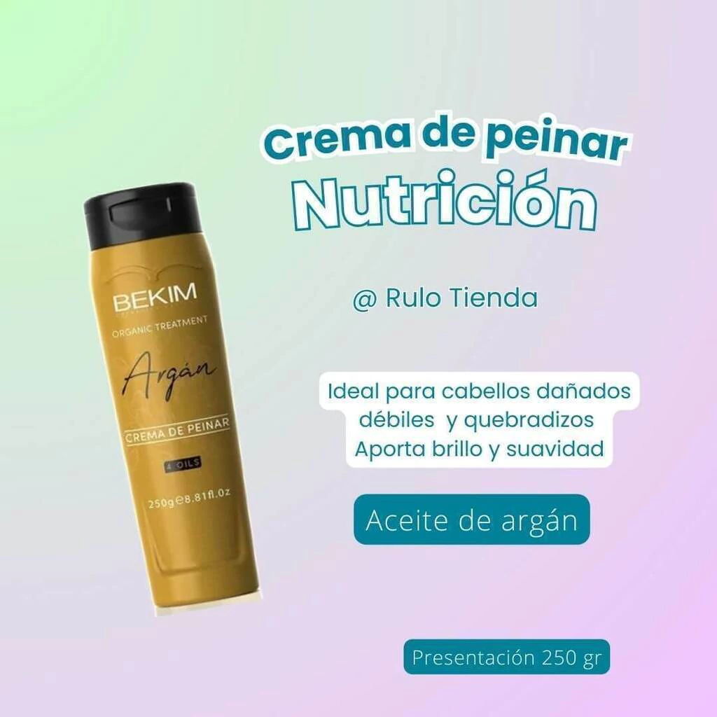 DescripciónARGÁN 4 OILS, nutre y protege los cabellos extremadamente secos, apagados y débiles. Libre de parabenos y colorantes. Penetra en la fibra capilar permitiendo que el cabello luzca instantáneamente reparado, nutrido, suave, manejable y con un brillo absoluto. Es un tratamiento que nutre y protege los cabellos extremadamente secos, apagados y débiles.Crema de peinado BEKIM Argán 4 oil fue creada para modelar el cabello y lograr una nutrición intensa (Sin enjuague). Repara y fortalece la fibra capilar dañada. La combinación de 4 aceites esenciales, principalmente el argán oil, devuelven al cabello sedosidad, suavidad, brillo y la naturalidad de un cabello sano. Contiene filtro solar.