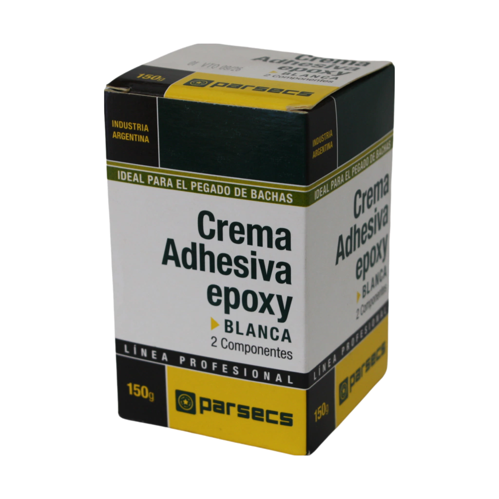 Características- Marca: PARSECS.- Linea: Cremas Adhesivas.- Estuche: 150g. - Terminacion: Rigida.- Color: Blanco. - Densidad: 1.6 + 0.1 g/cm3.- Producto de 2 componentes en partes iguales. Relacion Mezcla 1:1.- Resistencia a Temperaturas -20° a 100°C.- Temperatura de Descomposicion 202°C.- Resistencia a la Traccion: 250kg/cm2.- Estabilidad dimens.: No produce cambio de vol. durante fraguado.- Tiempo abierto de trabajo: 45 minutos.- Consistencia: no escurre en un espesor de 5 mm.- Tiempo de puesta en servicio: 8 Horas. (Maxima Resistencia 24hs)- Rendimiento: 3.4 kg/m2 cada 2mm de espesor.- Utilidades: fijar ganchos, tarugos, tornillos.- Utilidades: adherir bachas de cocina a mesadas.- Utilidades: fijar accesorios, pegar ceramicos y azulejos.- Utilidades: sellar o rellenar rajaduras de tanques de agua o loza.- Utilidades: reconstruir, rellenar o unir piezas.- Adhiere sobre: hierro, acero inoxidable, aluminio, azulejos.- Adhiere sobre: madera, vidrio, hormigon, granito.- Adhiere sobre: plomo, cobre, bronce, marmoles.