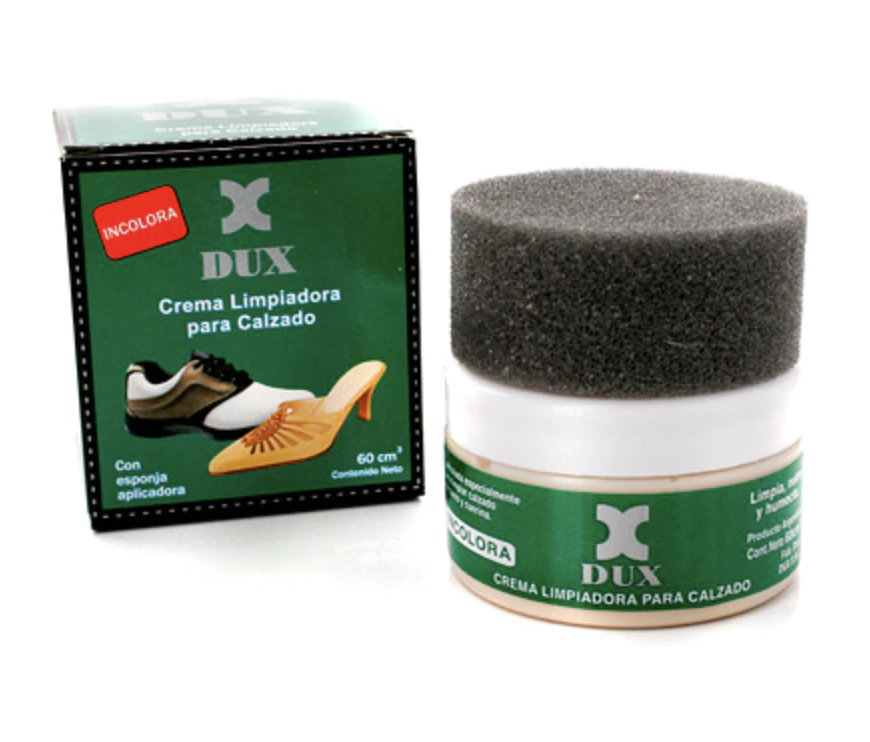 MODO DE USO:Distribuir en el calzado con movimientos circulares una pequeña cantidad de crema Limpiadora DUX.Esperar unos minutos y frotar con la esponja adjunta para quitar toda la suciedad del objeto a limpiar.La crema Limpiadora DUX es incolora y ha sido especialmente formulada para limpiar la suciedad o roces en calzado de cuero o cuerina de colores claros.ENVASE:Pote con esponja aplicadora 60cm3.