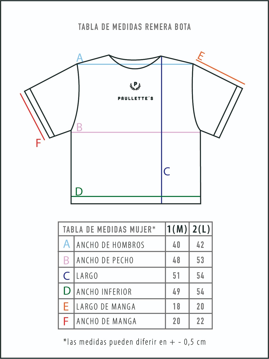 Para que te quede perfecta, te dejamos la tabla de medidas más abajo. Podés comparar estas medidas con alguna remera que ya tengas y te calce bien, o si preferís, agarrá un centímetro y tomá tus propias medidas.
