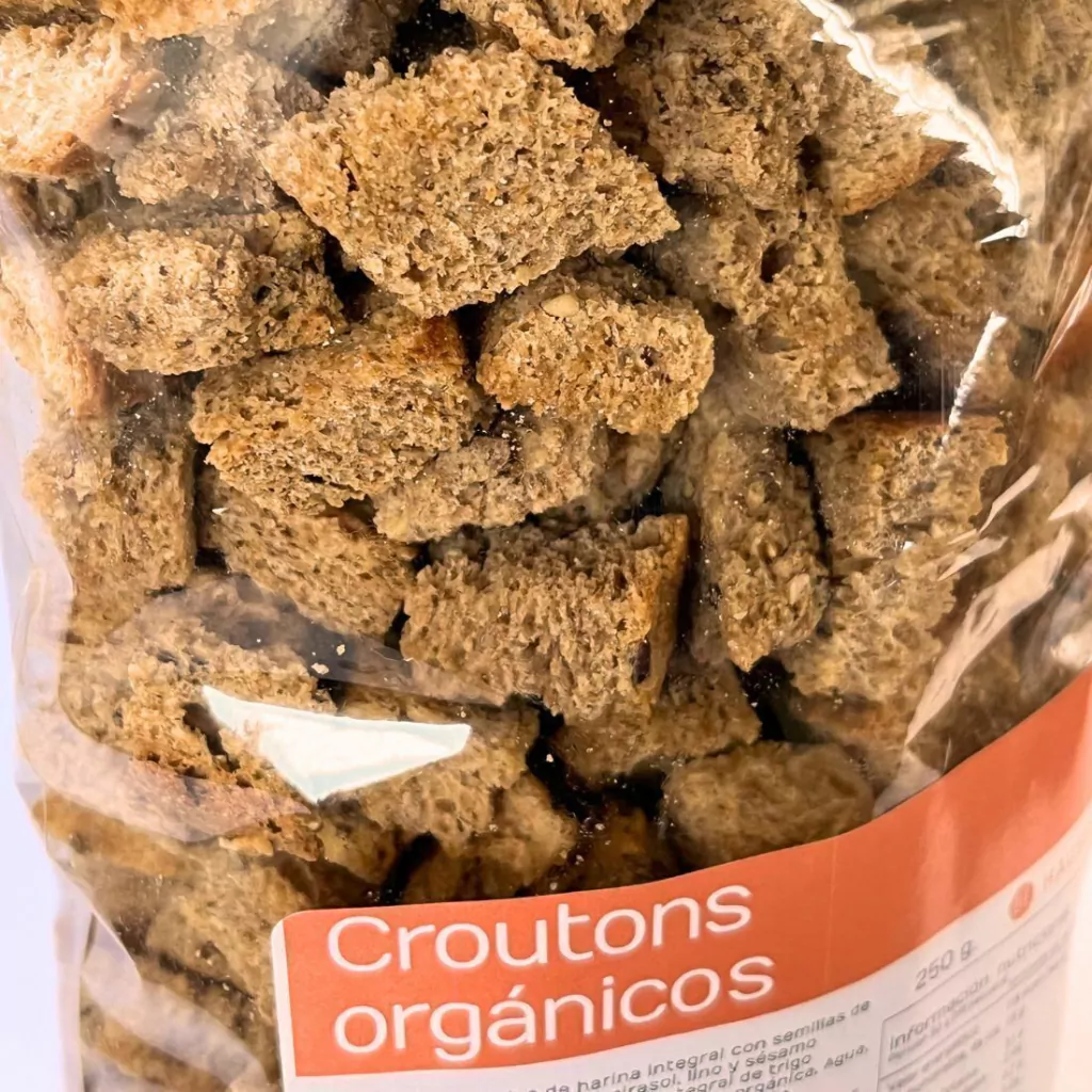 Crutones Orgánicos: ¡la opción perfecta para darle un toque especial a tus ensaladas y sopas! Hechos con pan integral orgánico y semillas, son ideales para quienes buscan un snack delicioso y saludable.