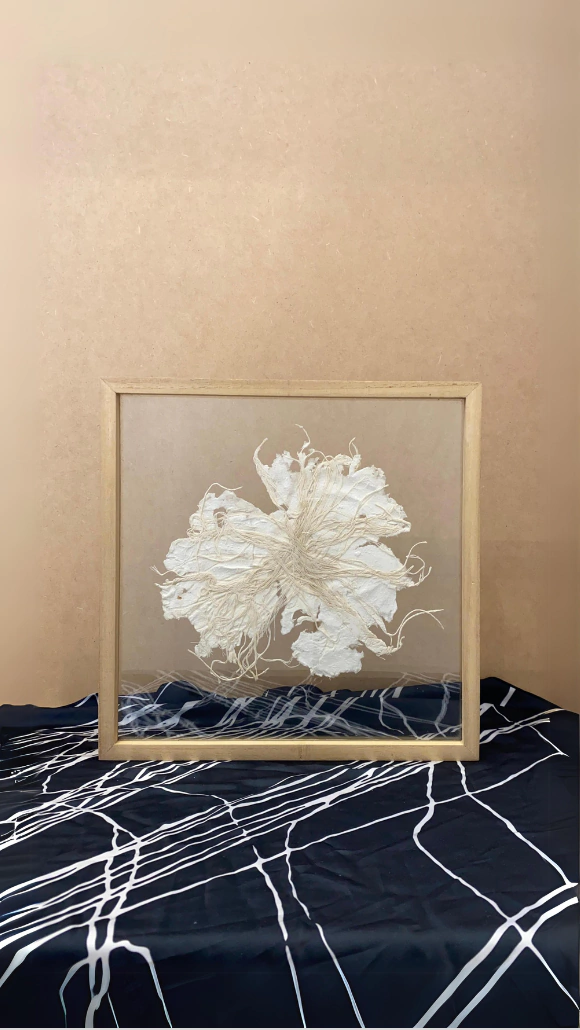 Diseño exclusivo en papel hecho a mano, marco de madera de kiri, con doble vidrio, fondo transparente. Esta pieza es única e irrepetible, es parte de la serie Frágil Arte Textil.