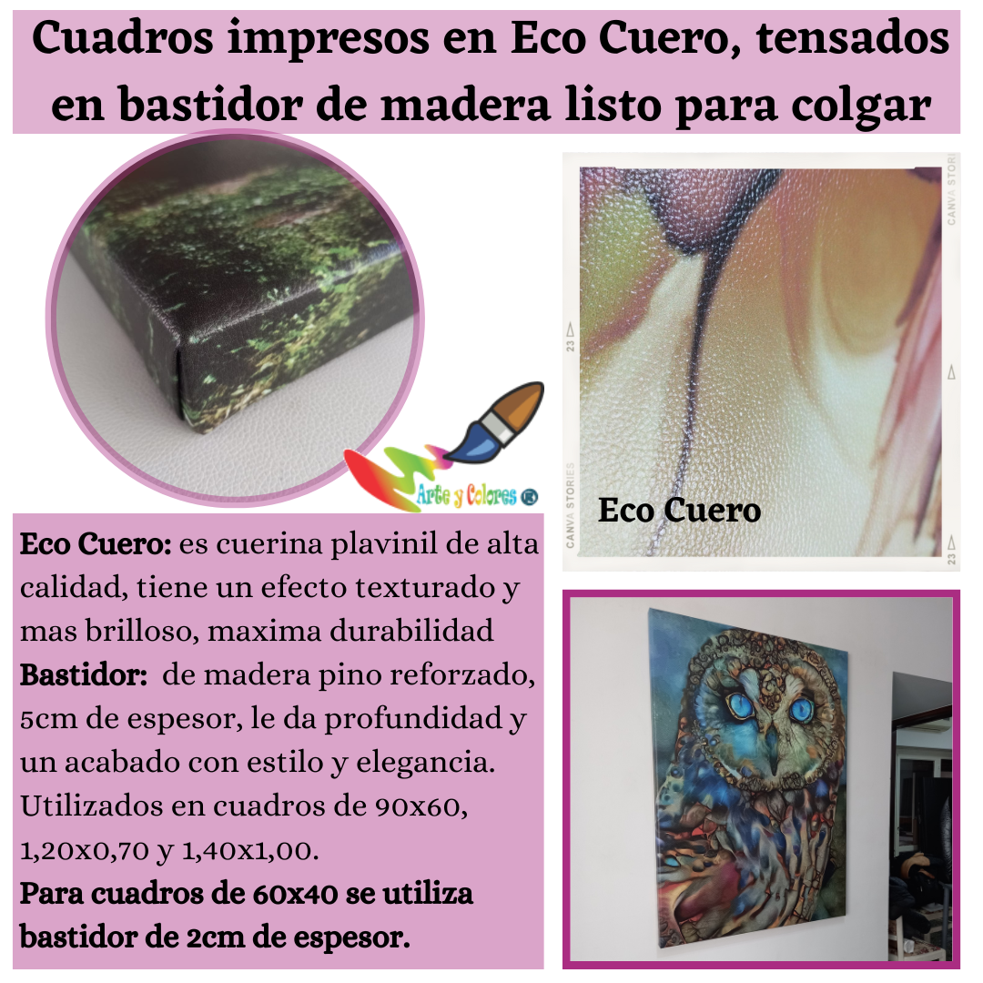Cuadro impreso en eco cuero tensado en bastidor de madera listo para colgar.