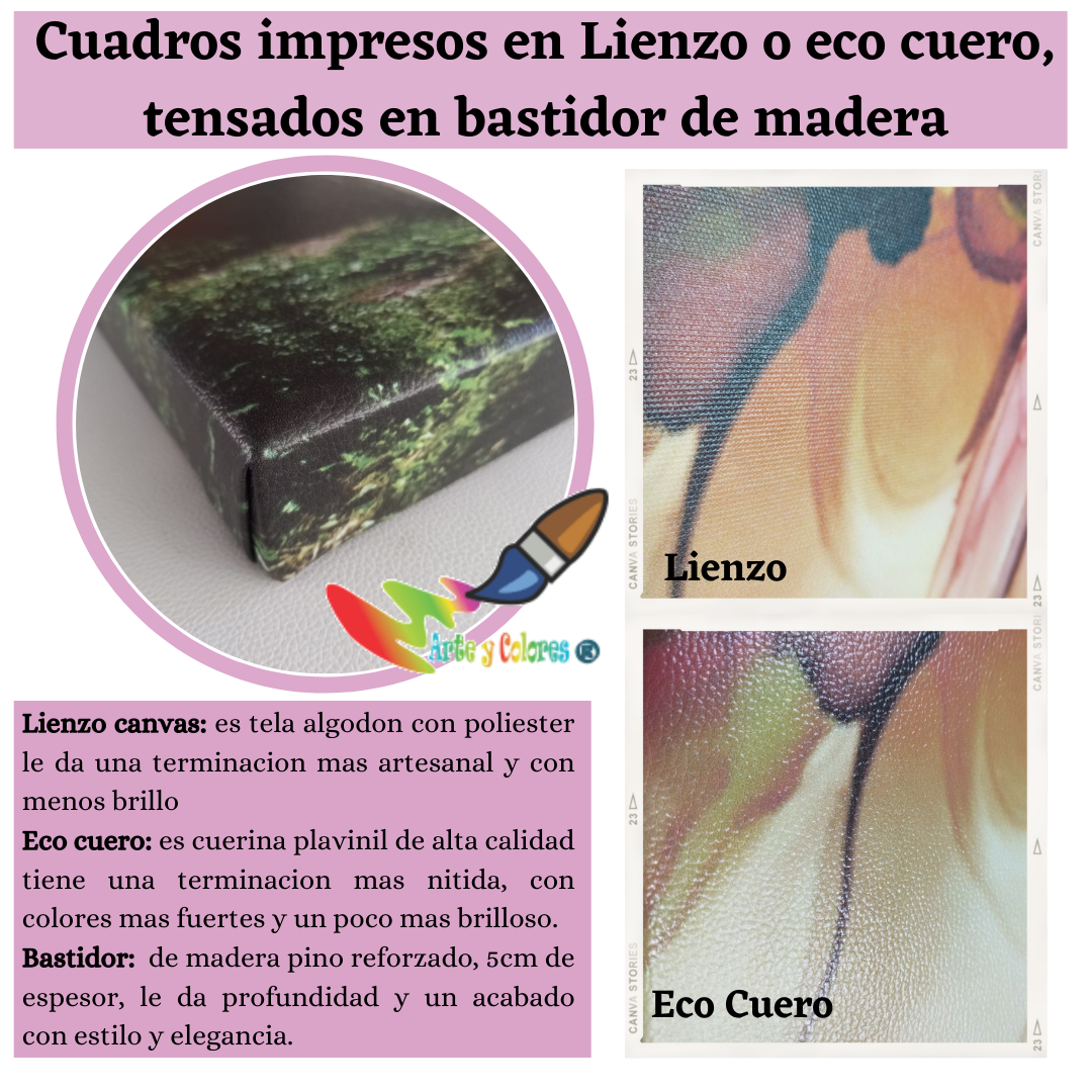Cuadro impreso en eco cuero o lienzo canvas tensado en bastidor de madera listo para colgar.