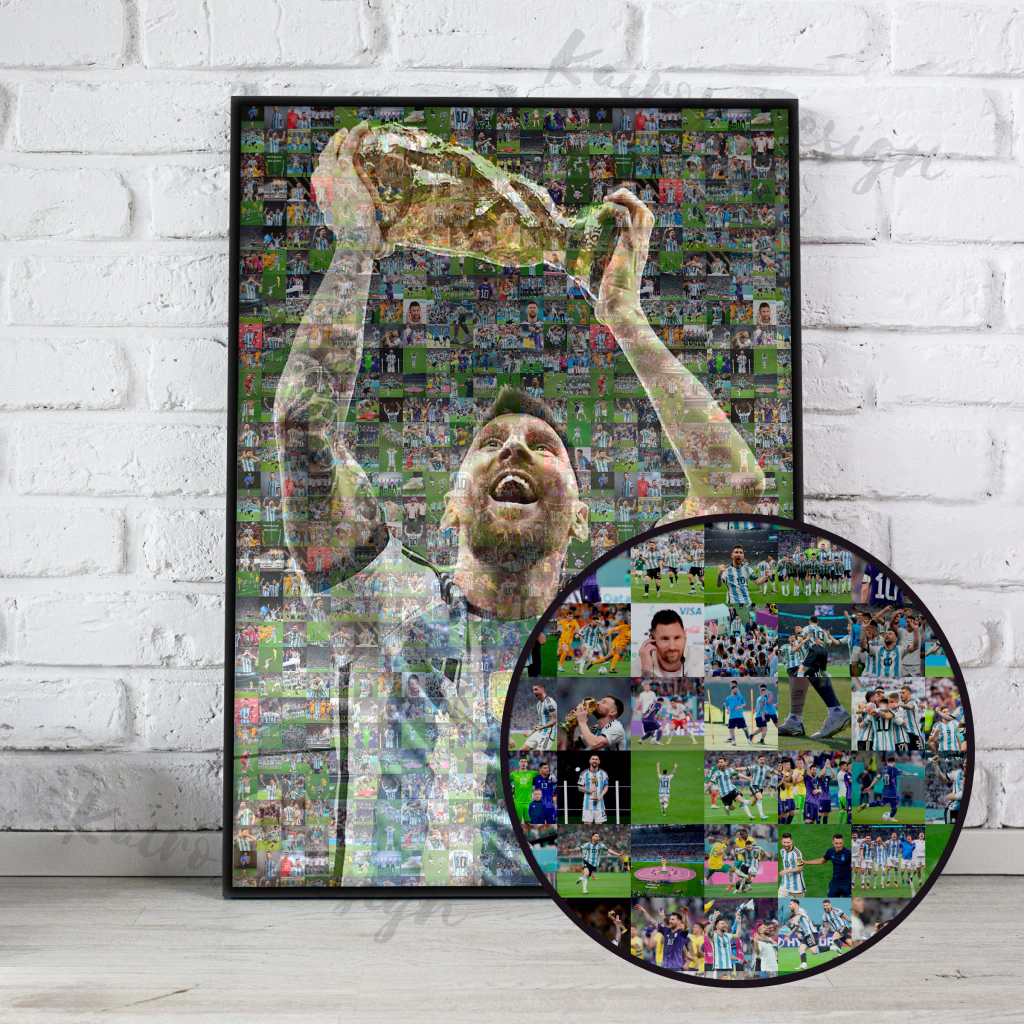 10% OFF ABONANDO POR TRANSFERENCIA BANCARIA / EFECTIVOEl cuadro consiste en muchas fotos chiquitas que forman una foto principal.Esta armado con más de 200 fotos distintas de Messi grupales e individuales del mundial.Las fotos son duplicadas para generar el efecto.El costo del producto incluye marco con vidrio. El color del marco puede ser negro, blanco, rojo o azul.Kairos Design