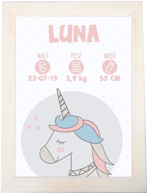 Cuadro "Unicornio"Marco de madera natural tamaño 18 x 24 cmsLamina con diseño personalizado que contiene los datos del bebe recien nacidoVidrioPara colocar sobre algún mueble