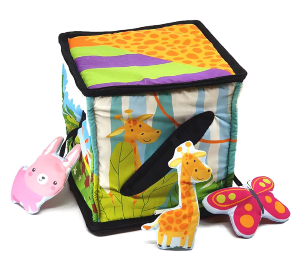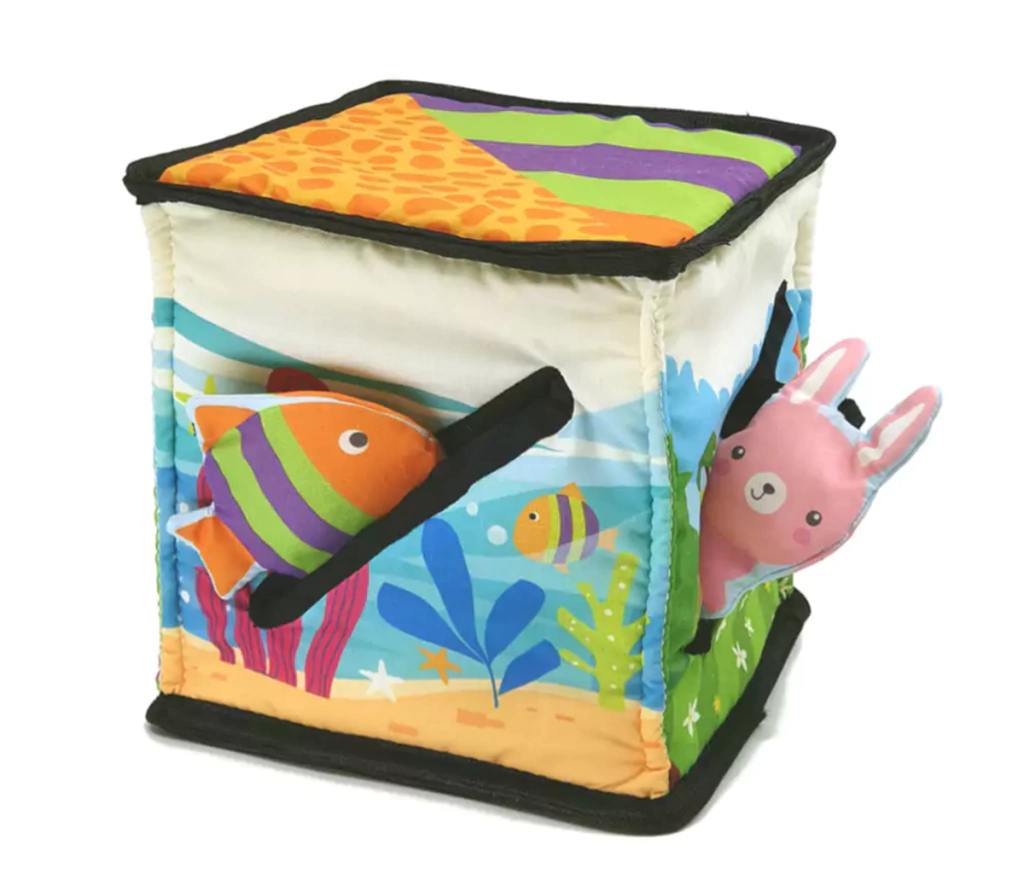 Meto una manito por aquí y otra por acá... ¡que suavecito! ¿Quién andará escondido por el bosque? ¿Y en el fondo del mar?. Vamos todos a buscar y adivinar quienes se esconden en este cubo lleno de sorpresas.Edad: +12 meses- Contenido: 1 cubo de 16 cm x lado- Materiales: Exterior: Algodón 60% Poliéster 40% estampado / Interior: Espuma poliuretano 100%- Cuidados: Lavar preferentemente a mano con agua fría.