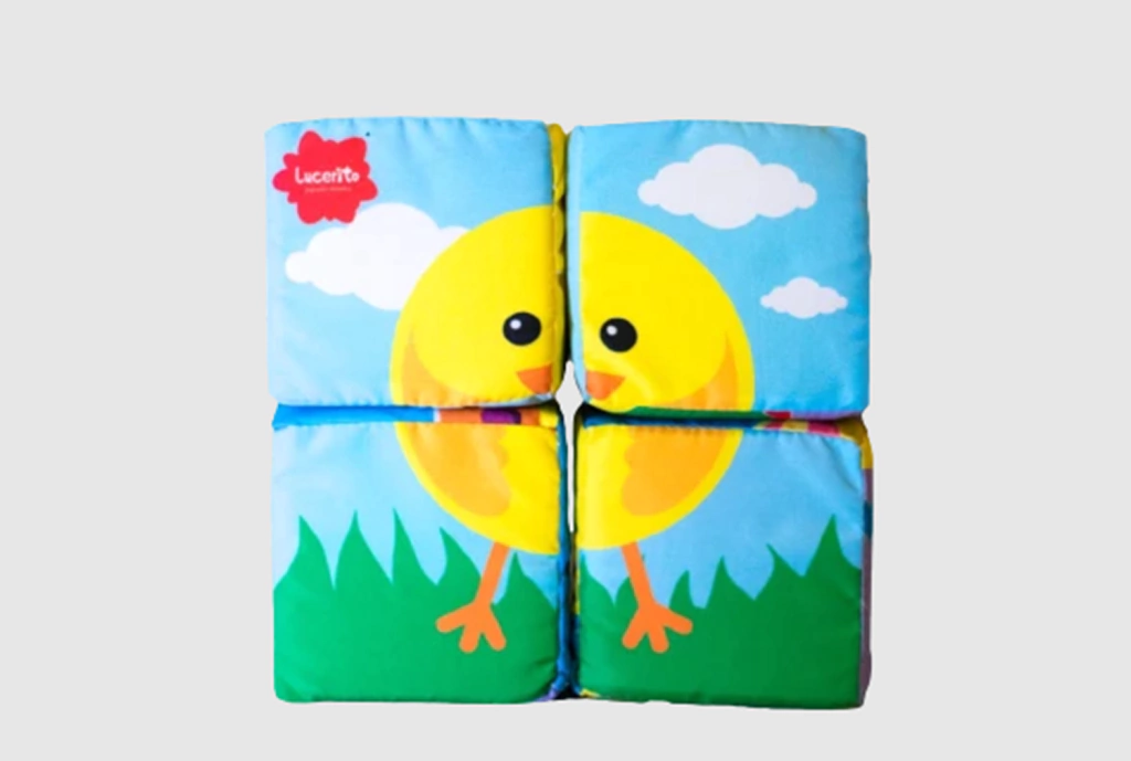 4 cubos de 8x8 cm.con 6 rompecabezas de diferentes dificultades para armar, fabricados en tela jersey de seda estampada