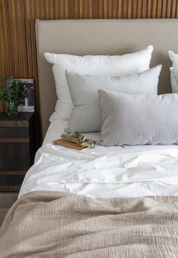 Cubre edredón reversible, de tussor color off white, con apertura para incorporación opcional de relleno -no inluído- removible para el lavado o días calurosos.
