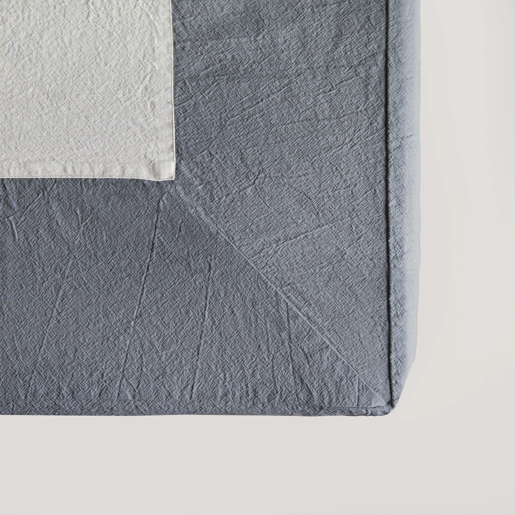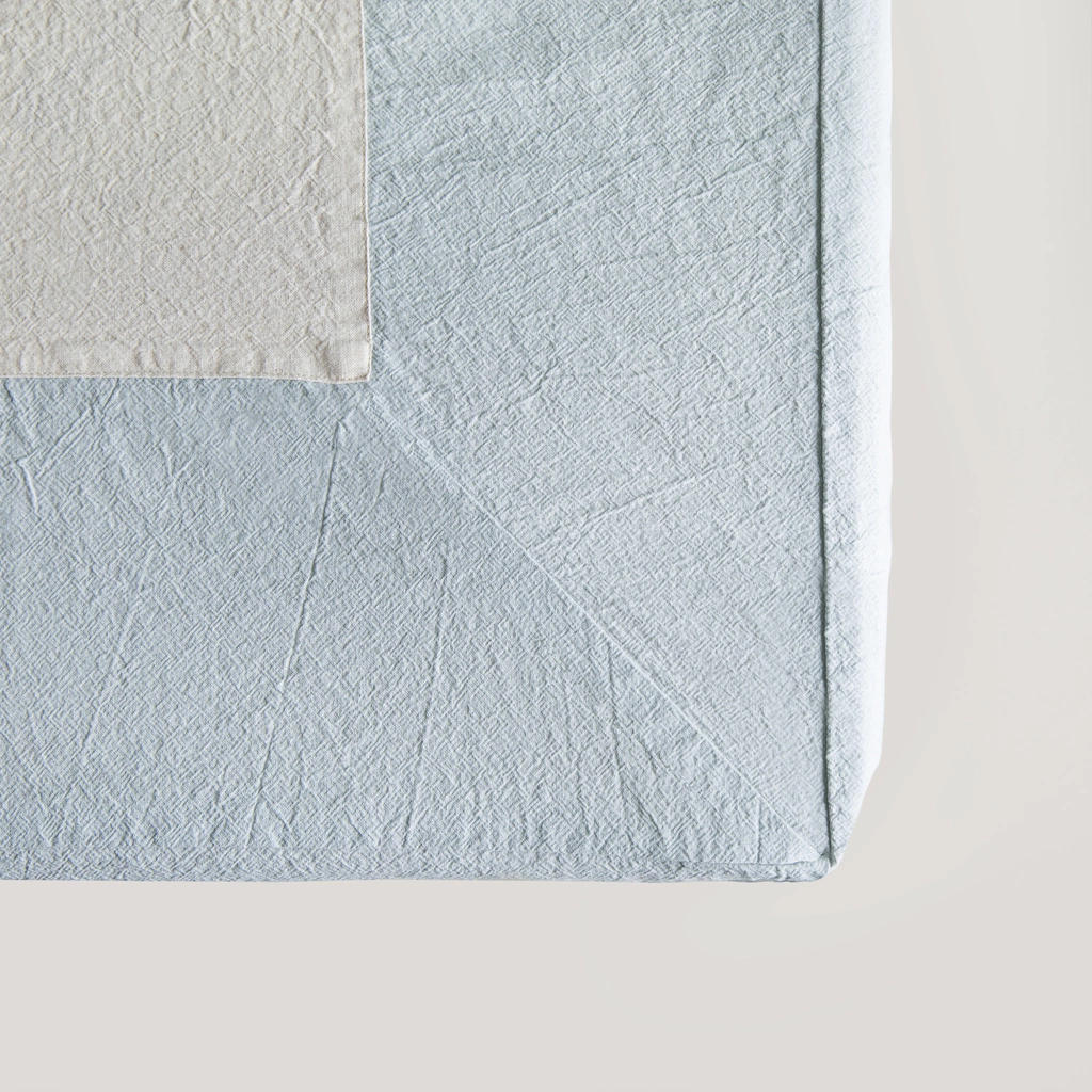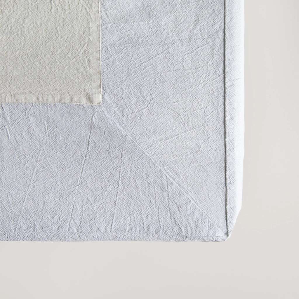 Dale un toque renovado a tu dormitorio con el Cubre Sommier Queen, confeccionado en tusor lienzo liviano 100% algodón y con un elegante parche en el centro de liencillo crudo.