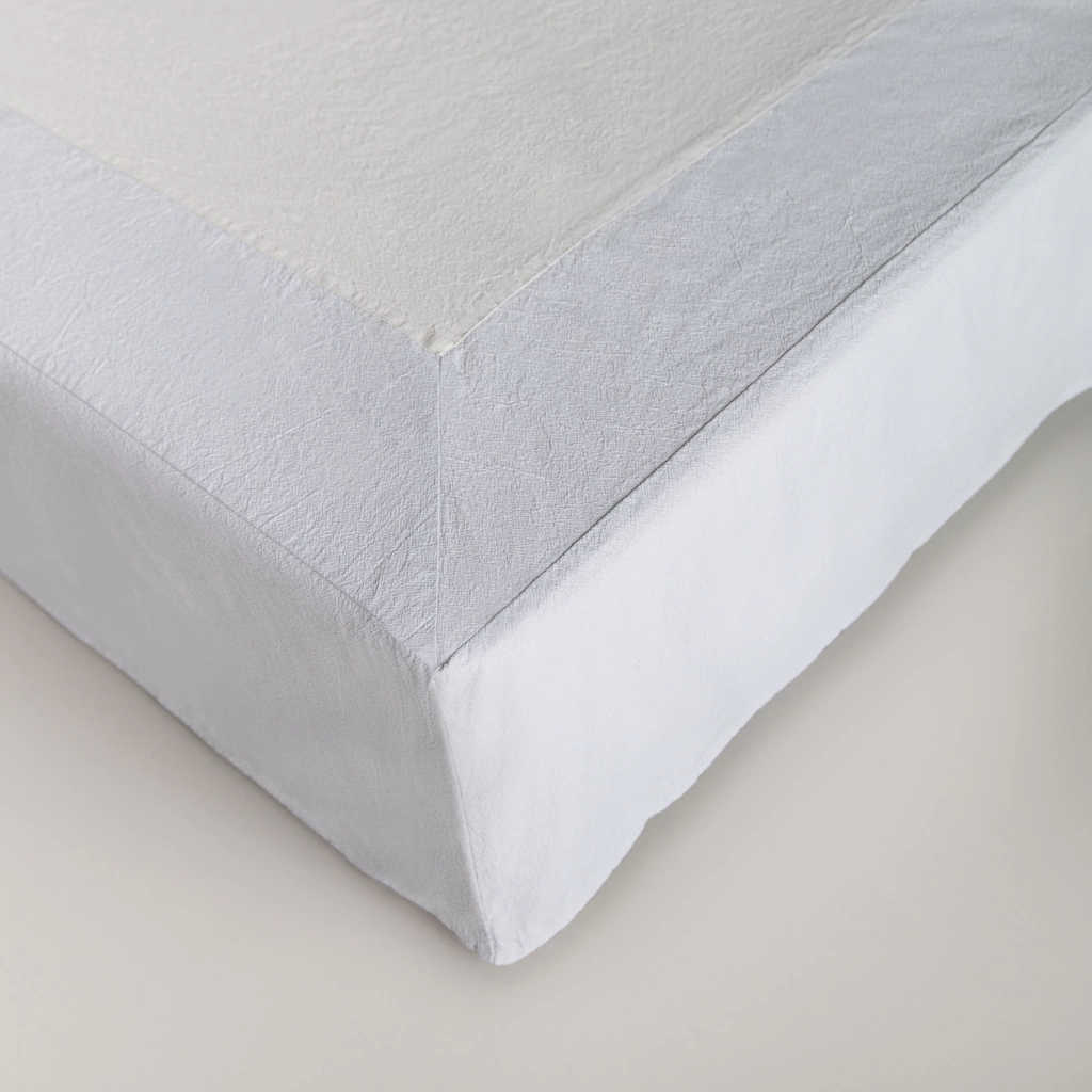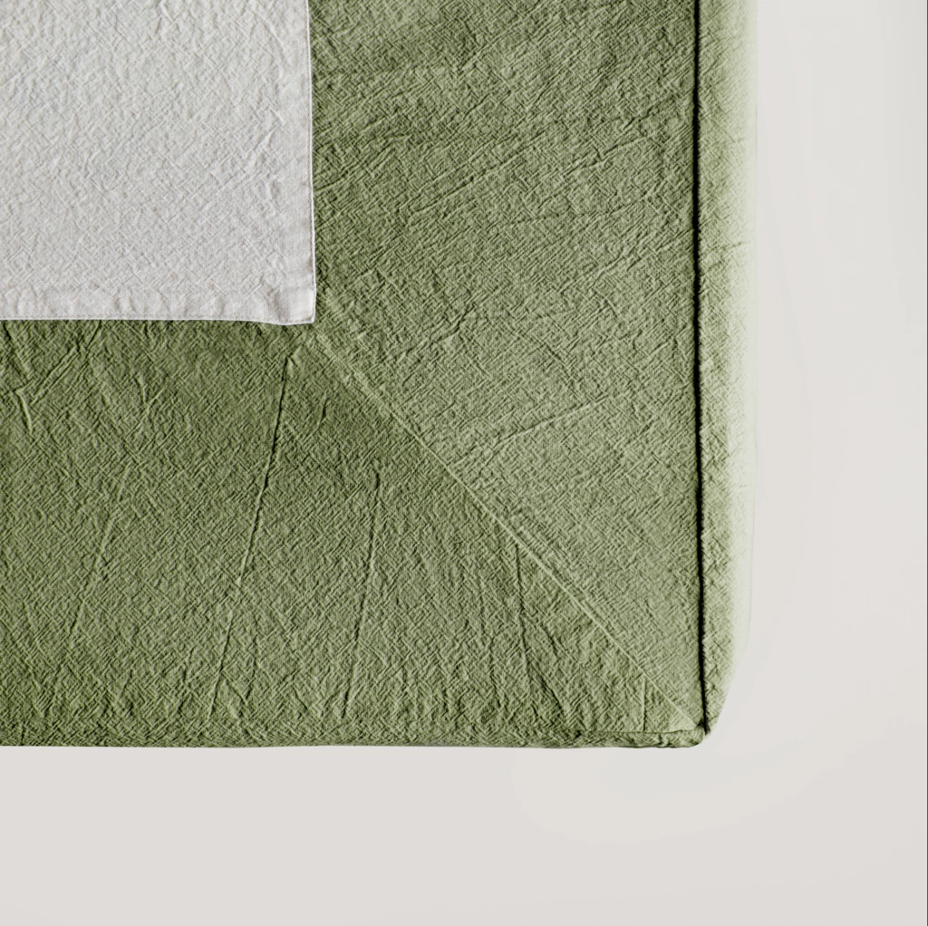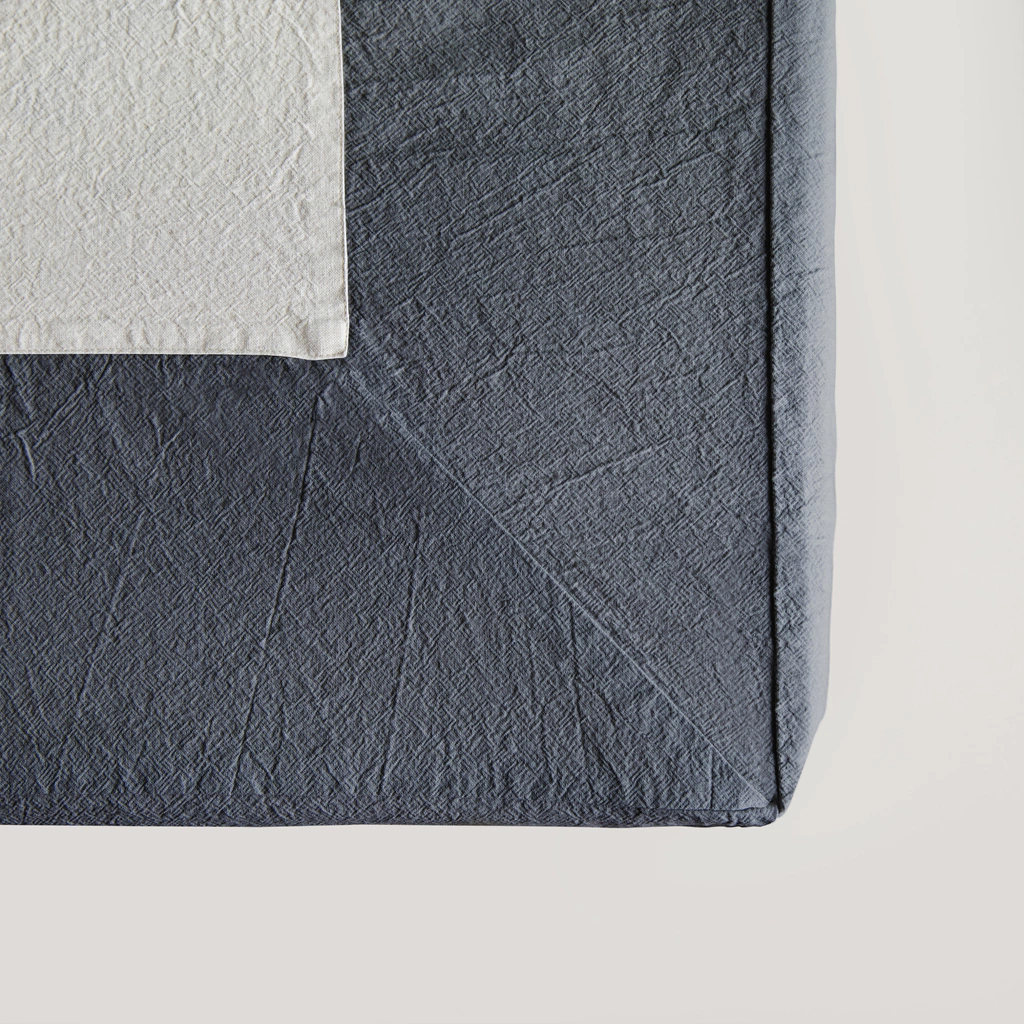 Dale un toque renovado a tu dormitorio con el Cubre Sommier Queen, confeccionado en tusor lienzo liviano 100% algodón y con un elegante parche en el centro de liencillo crudo.