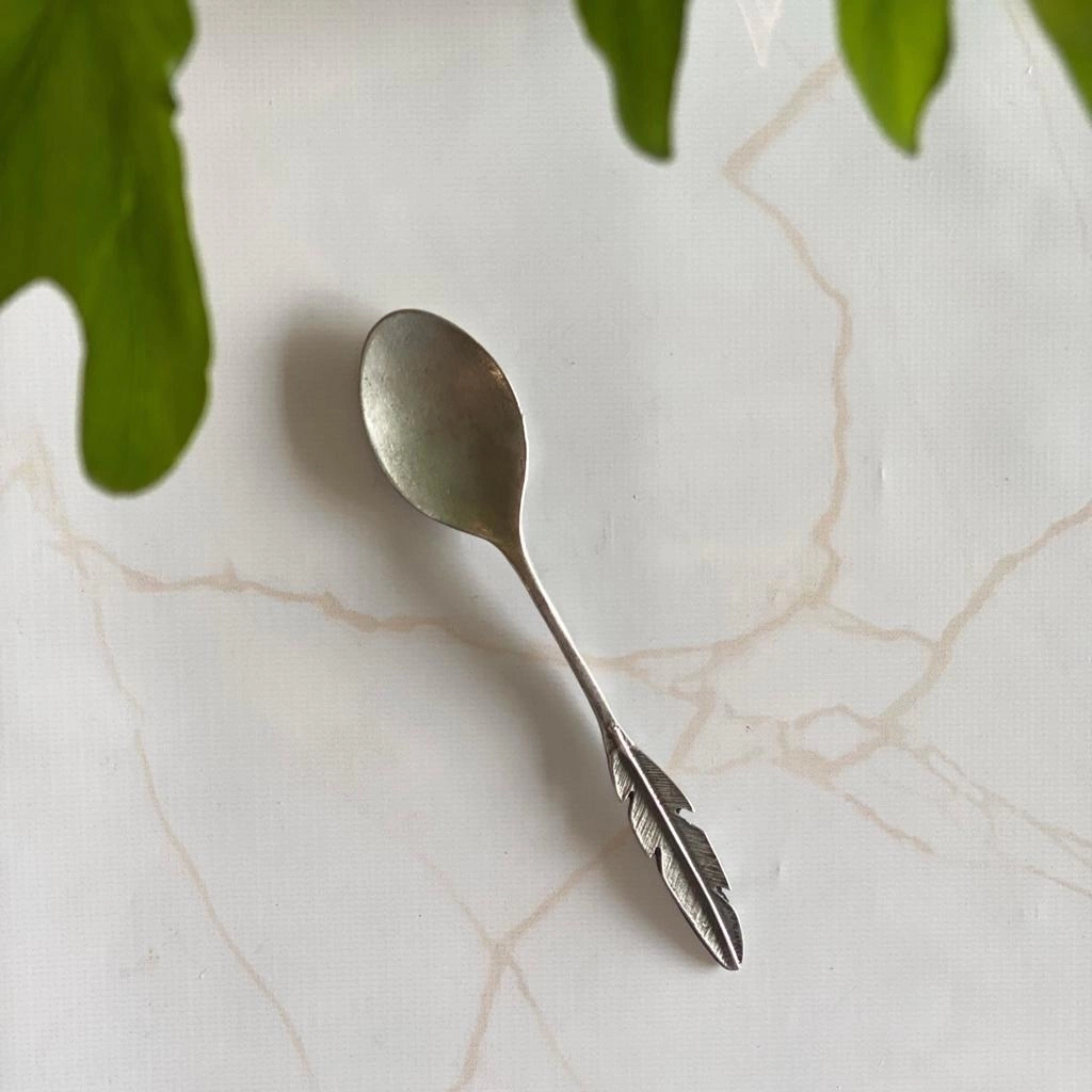 Cuchara en color plateado modelo de pluma en su terminación.MedidasLargo: 16cm.
