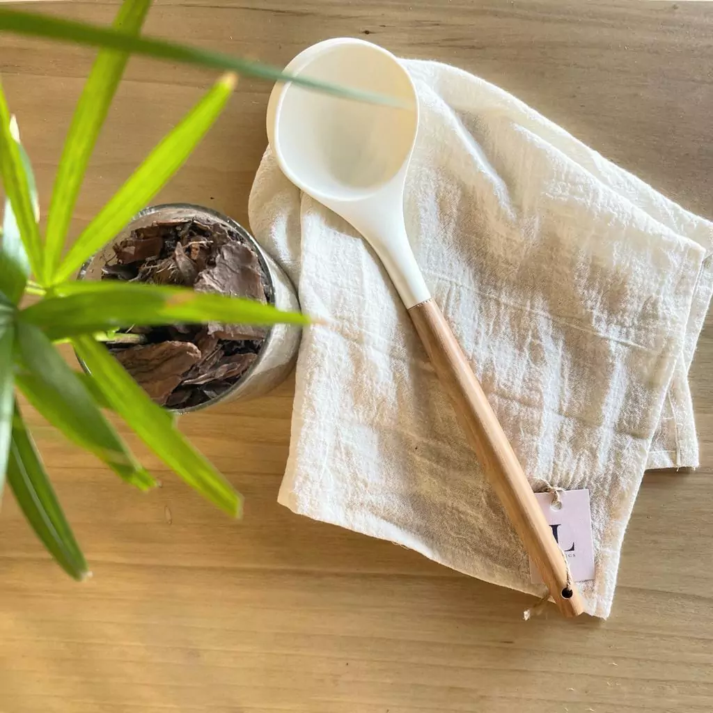 CUCHARON DE SILICONA COLOR CREMA CON MANGO DE MADERA . MEDIDA : 0,33 CM
