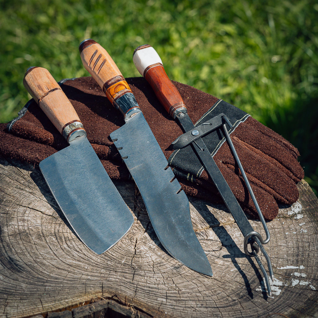 Cuchilla Bowie y Hacha de Disco Arado + Tenedor Expulsador + Guantes Parrilleros¿Buscás herramientas de calidad para tus asados?¡No busques más!Este set indispensable incluye:Cuchilla Bowie:Con una hoja de20 cm de disco de arado, diseñada para cortes precisos. Perfecta para esos cortes de carne que tanto disfrutás. Viene con filo base, lista para ser asentada, cumpliendo con las políticas de seguridad de la empresa de transporte.Hacha de Disco Arado:Con una hoja de16 cm, ideal para picar y preparar tus carnes. Su diseño robusto garantiza que no te fallará en el momento crítico.Tenedor Expulsador:Un complemento esencial que te permitirá manejar la carne con facilidad y precisión.Guantes Parrilleros Reforzados con Kevlar:Para que puedas manipular el fuego de manera segura.Talle único.Material de las herramientasTanto la cuchilla como el hacha están fabricadas con disco de arado, garantizando durabilidad y rendimiento. Simplemente limpiá con una servilleta después de usarlos y evitá dejarlos mojados para prolongar su vida útil.Nota importanteLos mangos son100% artesanales, por lo que pueden variar en forma y tonalidad respecto a las fotos. Si tenés alguna preferencia, no dudes en dejar una nota al momento de la compra.Opiniones de nuestros clientes⭐⭐⭐⭐⭐ Cristian: "Me encantó, excelente calidad." ⭐⭐⭐⭐⭐ Pablo Soles: "Lindo cuchillo para llevar a los asados." ⭐⭐⭐⭐ Susana Paz: "Precio y calidad, más que aceptable."No esperes más y sumá este imprescindible a tu arsenal parrillero.¡Sorprendé a todos en tu próximo asado!🥩🔥🛒