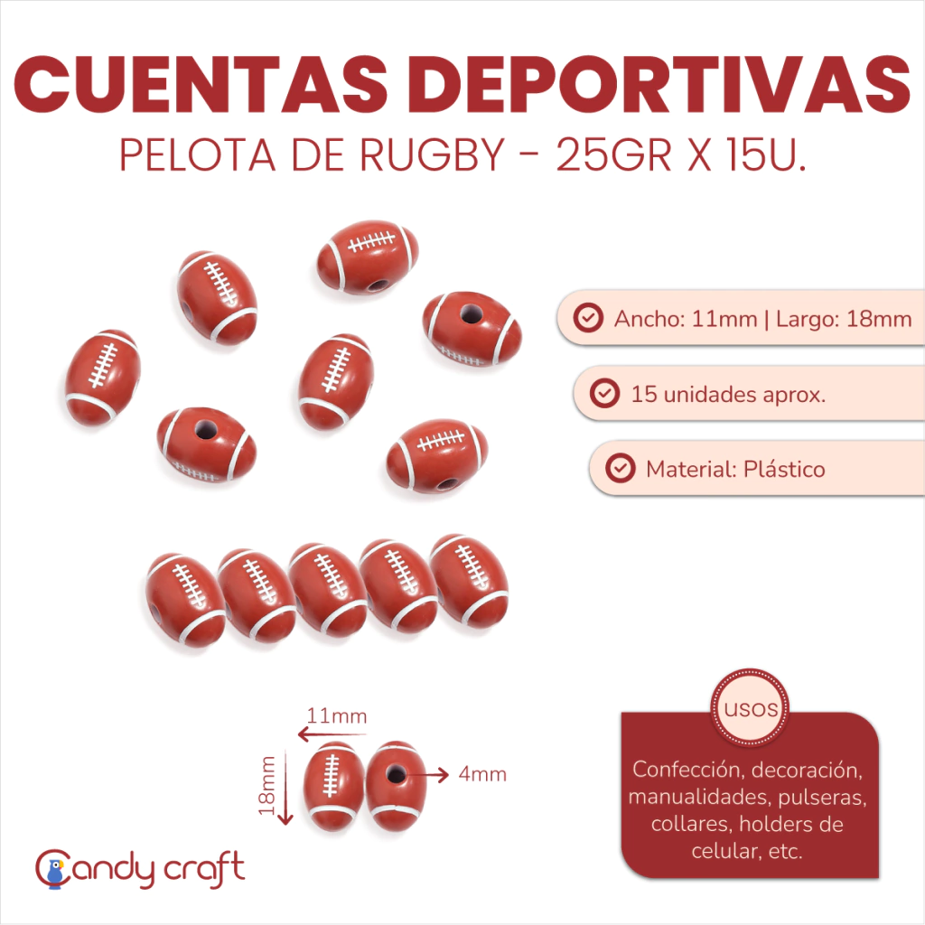 Medida: 18x11mm. Agujero: 4mm.  Cantidad: 1 paquetito de 25 gramos, con  aprox. 15 unidades. Material: Plastico.  Uso: Decoración, Manualidades, Pulseras, Collares, Holder para el celular, Llaveros, souvenirs, etc.