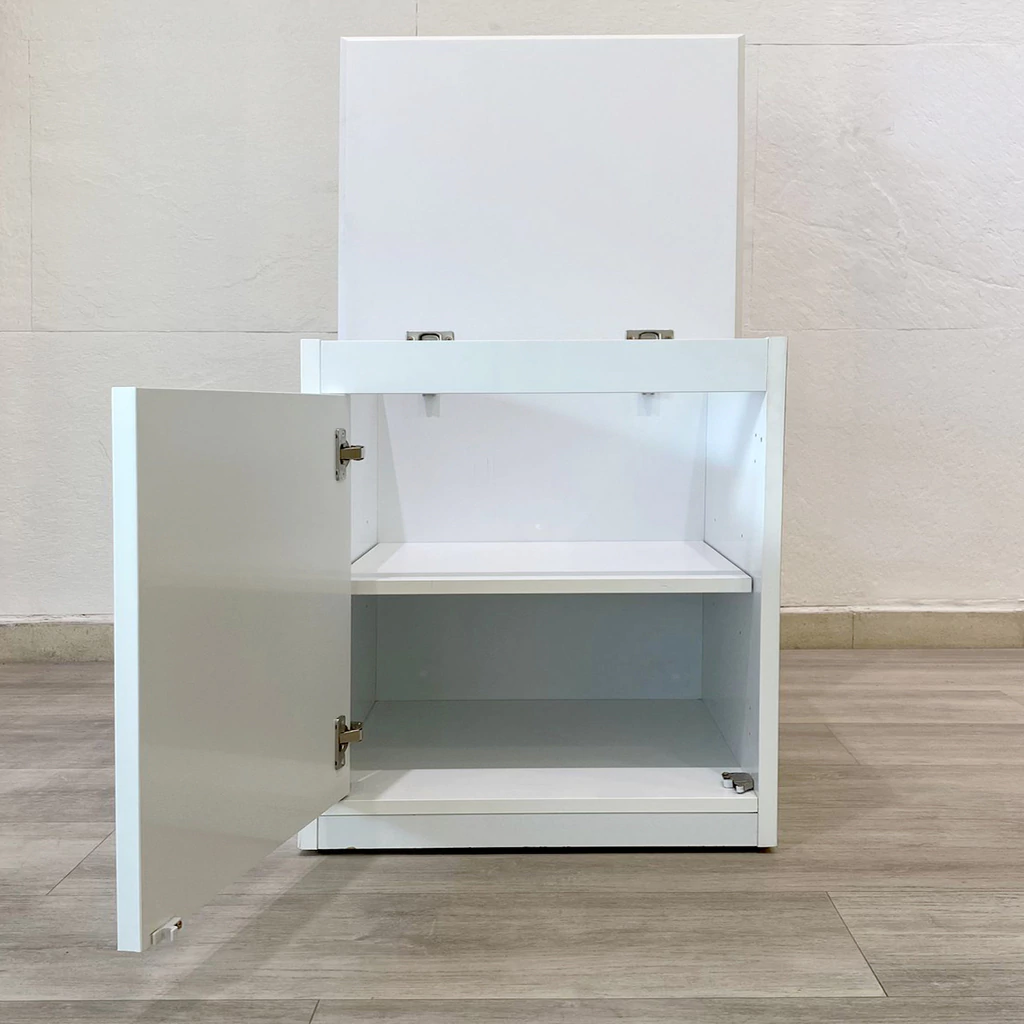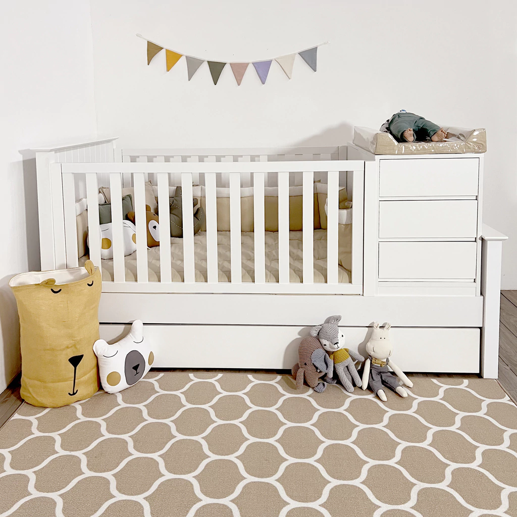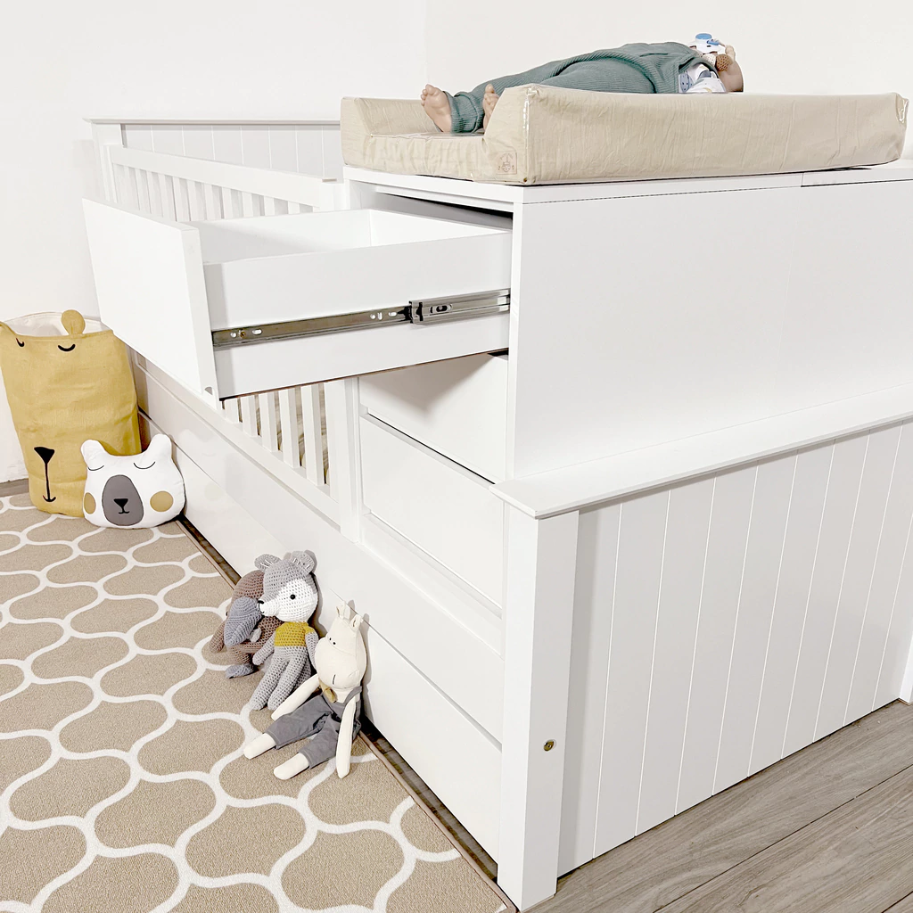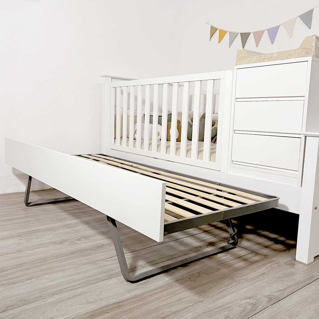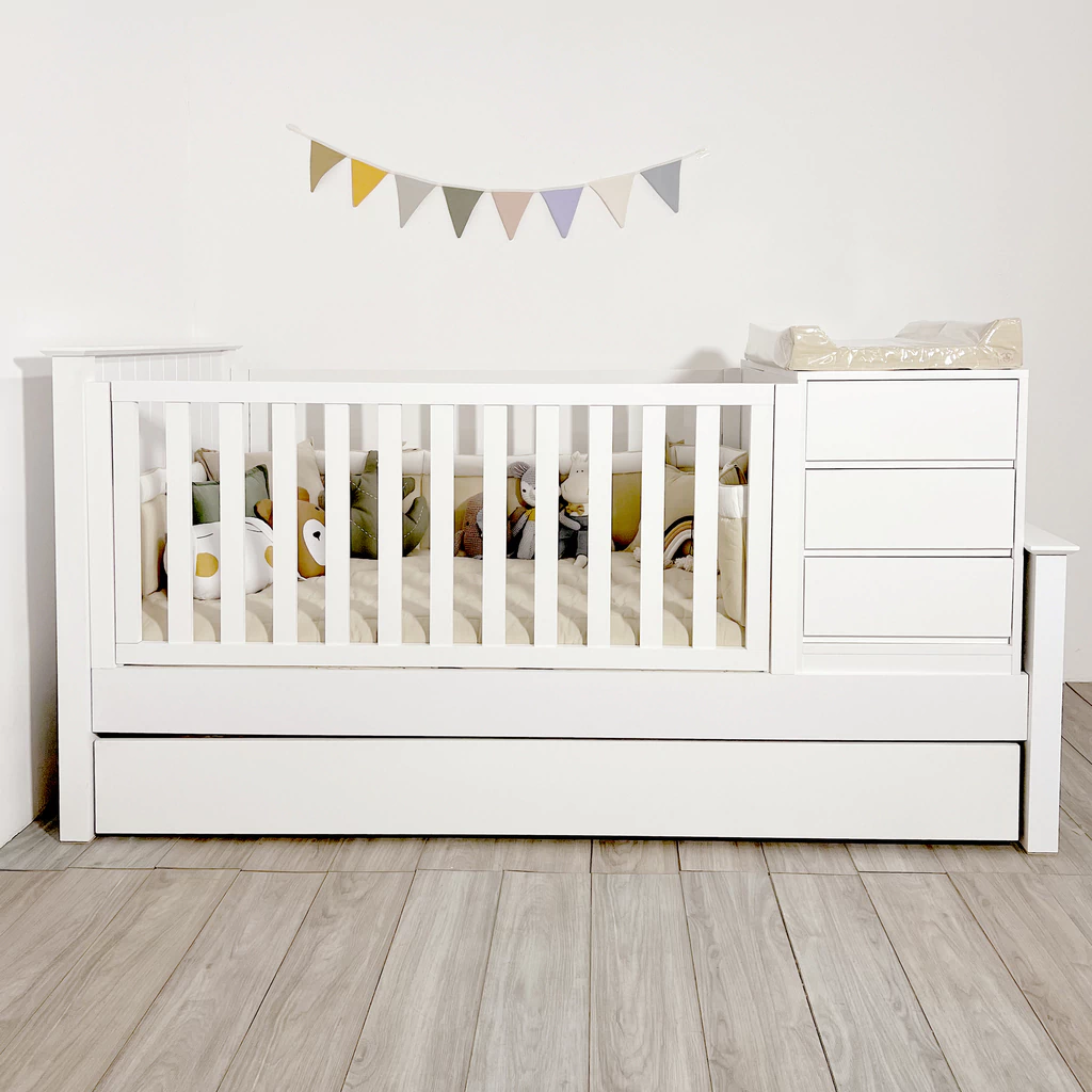 Las cunas funcionales están diseñadas para ser utilizadas a partir de los 6 meses en adelante. Estas cunas se transforman fácilmente en una cama de plaza ½, acompañadas de una mesa de luz y un baúl juguetero. Las barandas tienen una altura de 60 cm y cuentan con un sistema deslizable hacia arriba. Los cajones están equipados con guías telescópicas, y un uñero como sistema de apertura. Fabricadas con travesaños de madera maciza, brindando firmeza. Los respaldos, pieceras y largueros están hechos de Mdf laqueado atóxico en blanco. La cama carrito semi automática, permite que se eleve facilmente