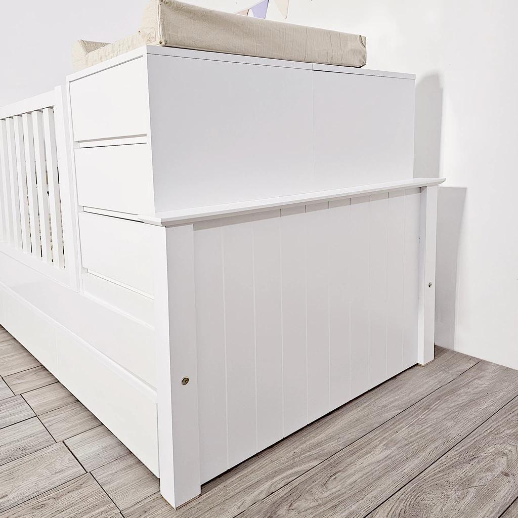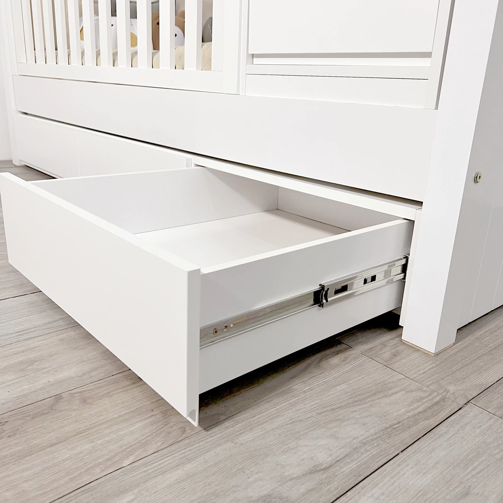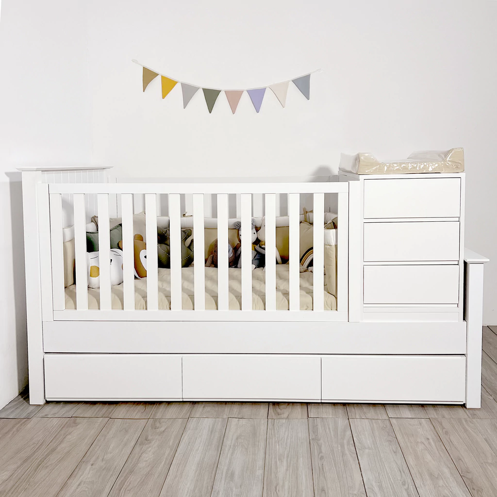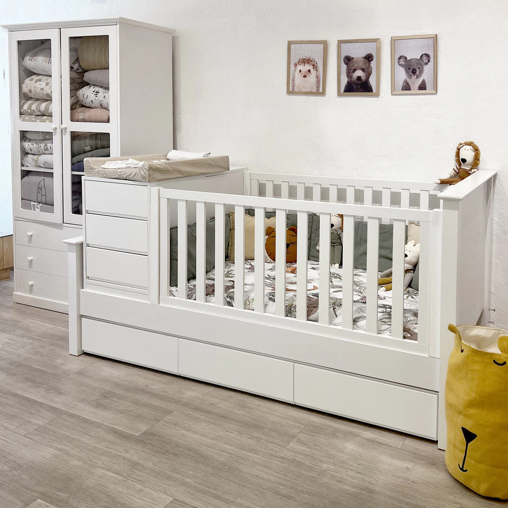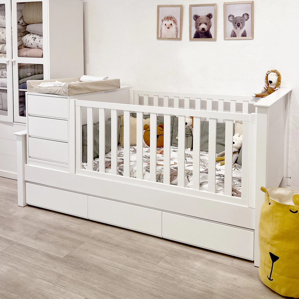 Las cunas funcionales están diseñadas para ser utilizadas a partir de los 6 meses en adelante. Estas cunas se transforman fácilmente en una cama de plaza ½, acompañadas de una mesa de luz y un baúl juguetero. Las barandas tienen una altura de 60 cm y cuentan con un sistema deslizable hacia arriba. Los cajones están equipados con guías telescópicas, y un uñero como sistema de apertura. Fabricadas con travesaños de madera maciza de Guatambú, brindando firmeza. Los respaldos, pieceras y largueros están hechos de Mdf laqueado atóxico en blanco