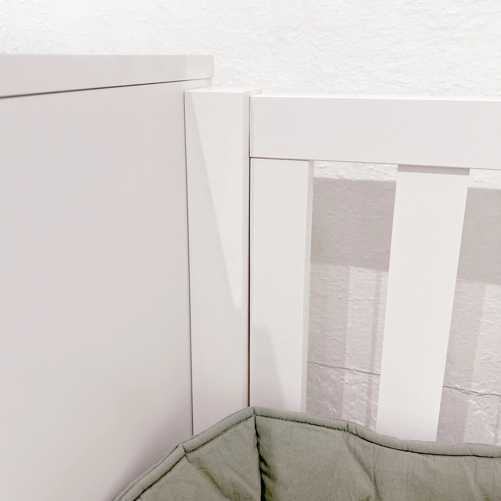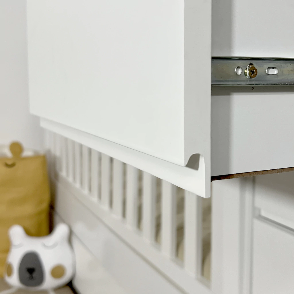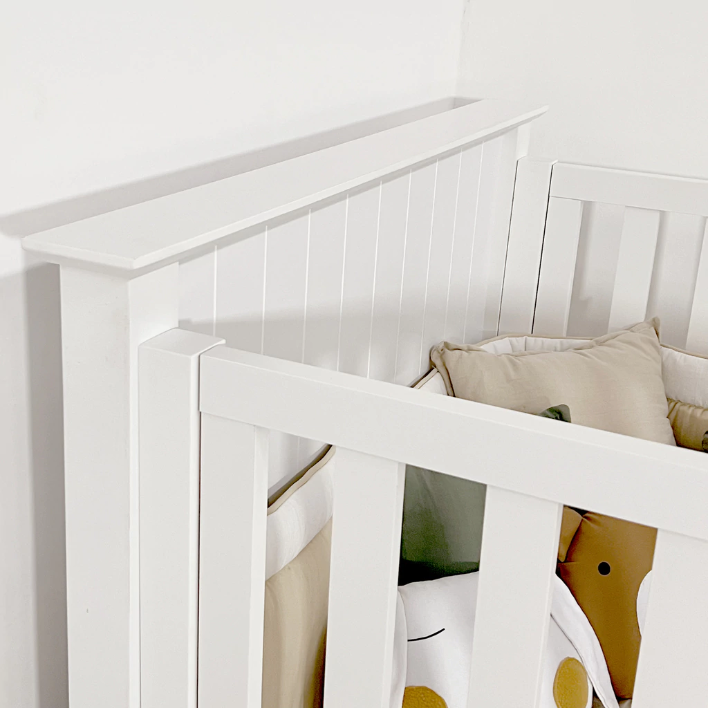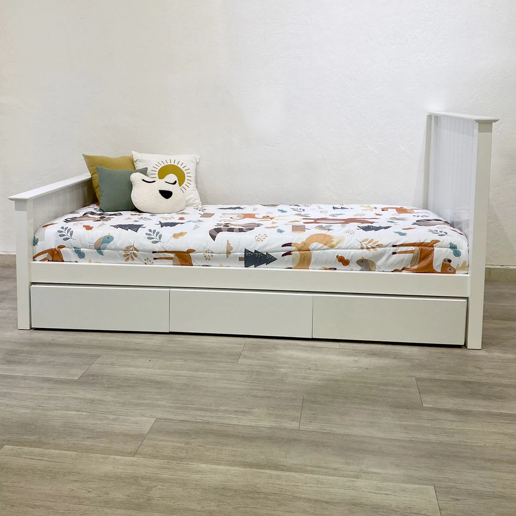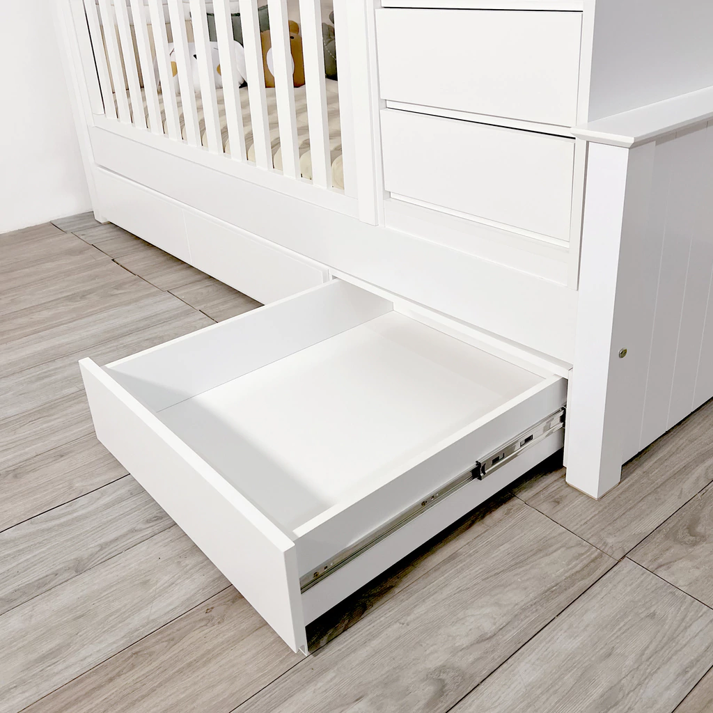 Las cunas funcionales están diseñadas para ser utilizadas a partir de los 6 meses en adelante. Estas cunas se transforman fácilmente en una cama de plaza ½, acompañadas de una mesa de luz y un baúl juguetero. Las barandas tienen una altura de 60 cm y cuentan con un sistema deslizable hacia arriba. Los cajones están equipados con guías telescópicas, y un uñero como sistema de apertura. Fabricadas con travesaños de madera maciza de Guatambú, brindando firmeza. Los respaldos, pieceras y largueros están hechos de Mdf laqueado atóxico en blanco