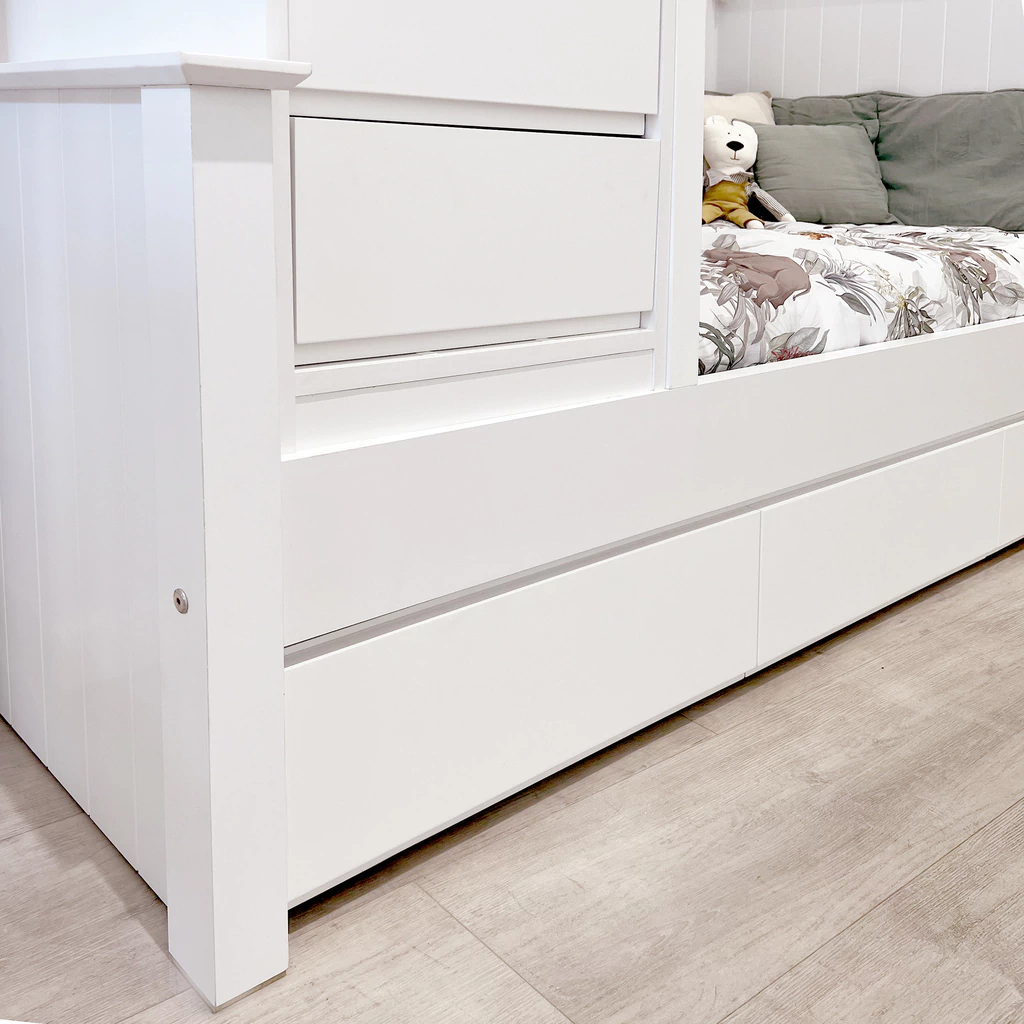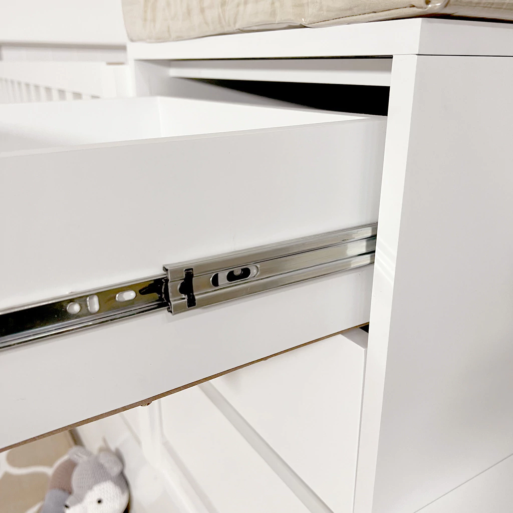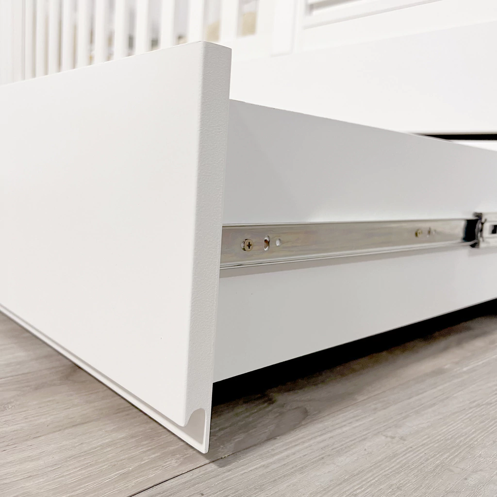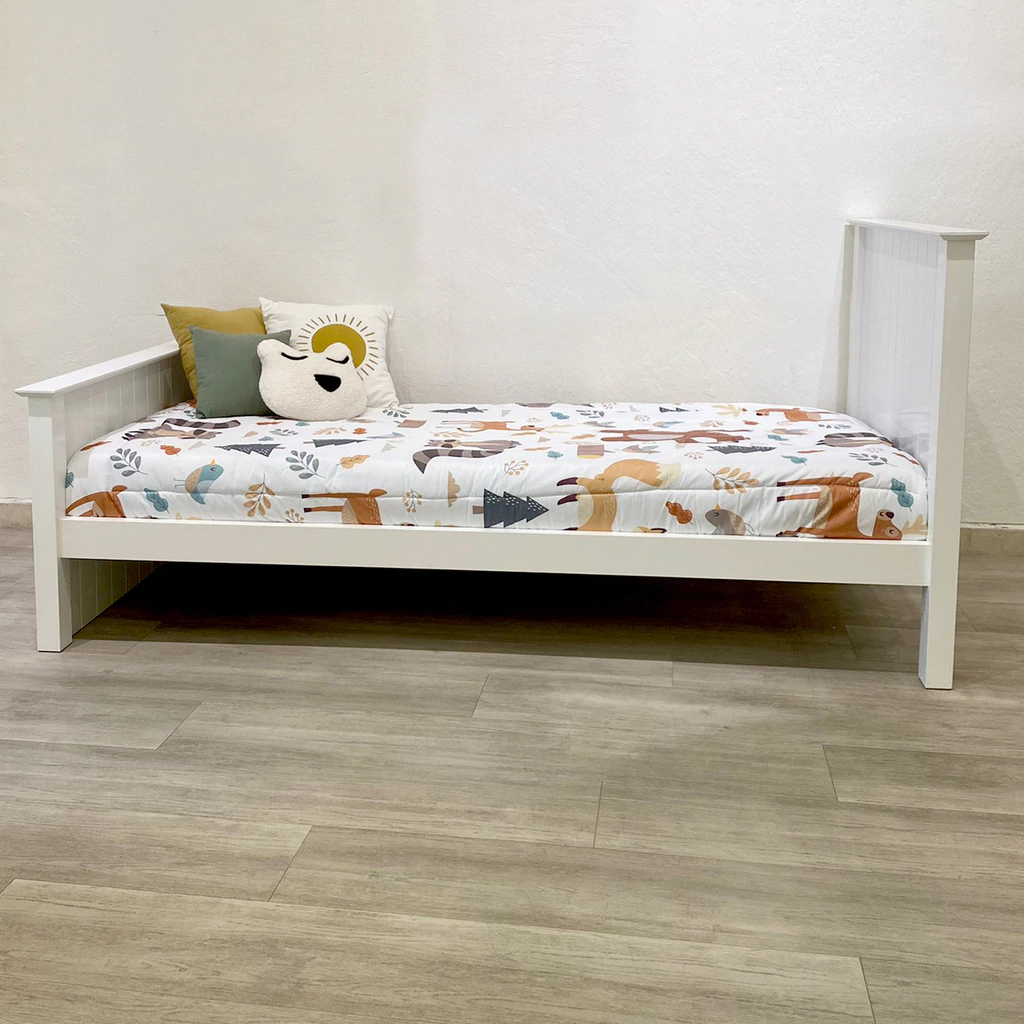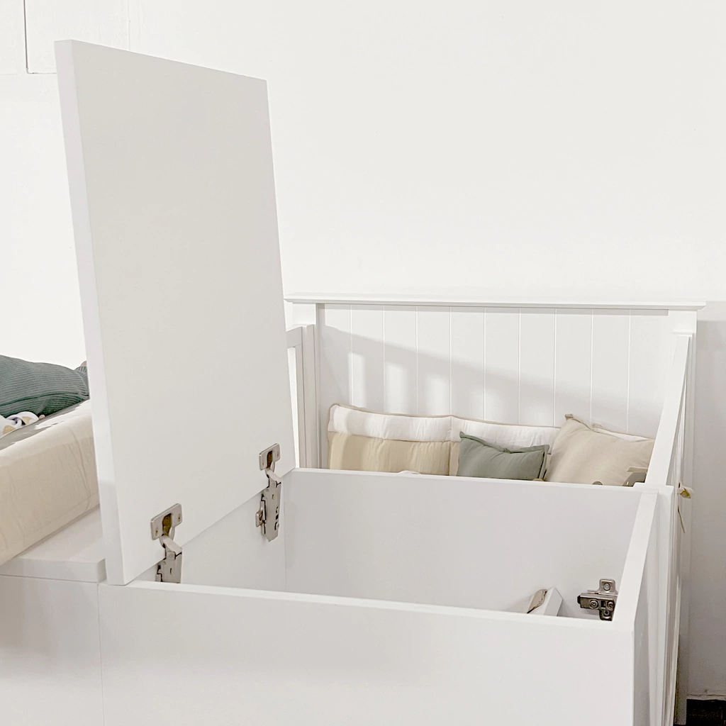 Las cunas funcionales están diseñadas para ser utilizadas a partir de los 6 meses en adelante. Estas cunas se transforman fácilmente en una cama de plaza ½, acompañadas de una mesa de luz y un baúl juguetero. Las barandas tienen una altura de 60 cm y cuentan con un sistema deslizable hacia arriba. Los cajones están equipados con guías telescópicas, y un uñero como sistema de apertura. Fabricadas con travesaños de madera maciza de Guatambú, brindando firmeza. Los respaldos, pieceras y largueros están hechos de Mdf laqueado atóxico en blanco
