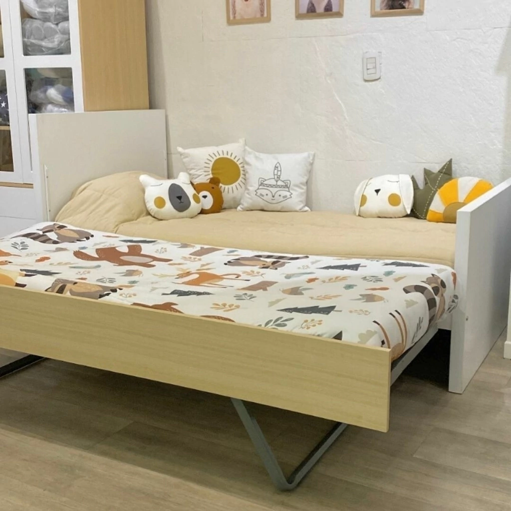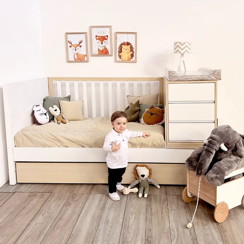 Las cunas funcionales están diseñadas para ser utilizadas a partir de los 6 meses en adelante. Estas cunas se transforman fácilmente en una cama de plaza ½, acompañadas de una mesa de luz y un baúl juguetero. Las barandas tienen una altura de 60 cm y cuentan con un sistema deslizable hacia arriba. Los cajones están equipados con guías telescópicas, y un uñero como sistema de apertura. Fabricadas con travesaños de madera maciza de Guatambú, brindando firmeza. Los respaldos, pieceras y largueros están hechos de Mdf laqueado atóxico en blanco, cuenta con una terminación antiraya ultra resistente, asegurando durabilidad y un acabado impecable. La cama carrito semi automática, permite que se eleve facilmente