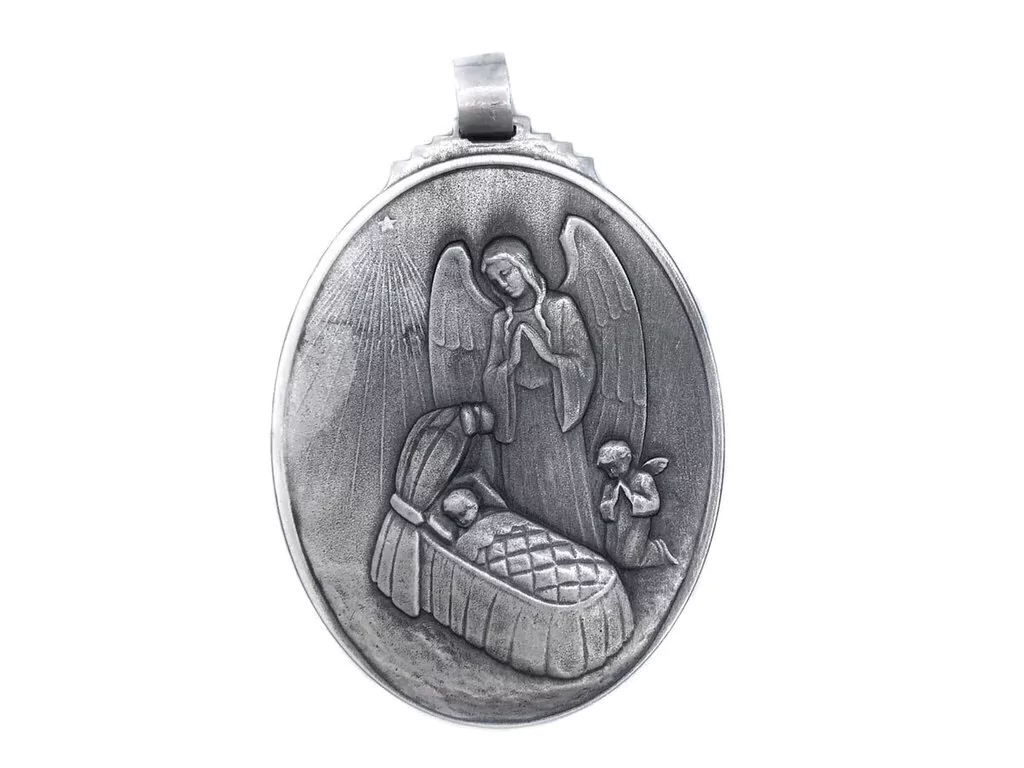 Dije Cunero de Aluminio rovalado, con diseño en relieve del Ángel de la Guarda con Niño en la cuna, 7cm de largo por 5,5cm de ancho.
