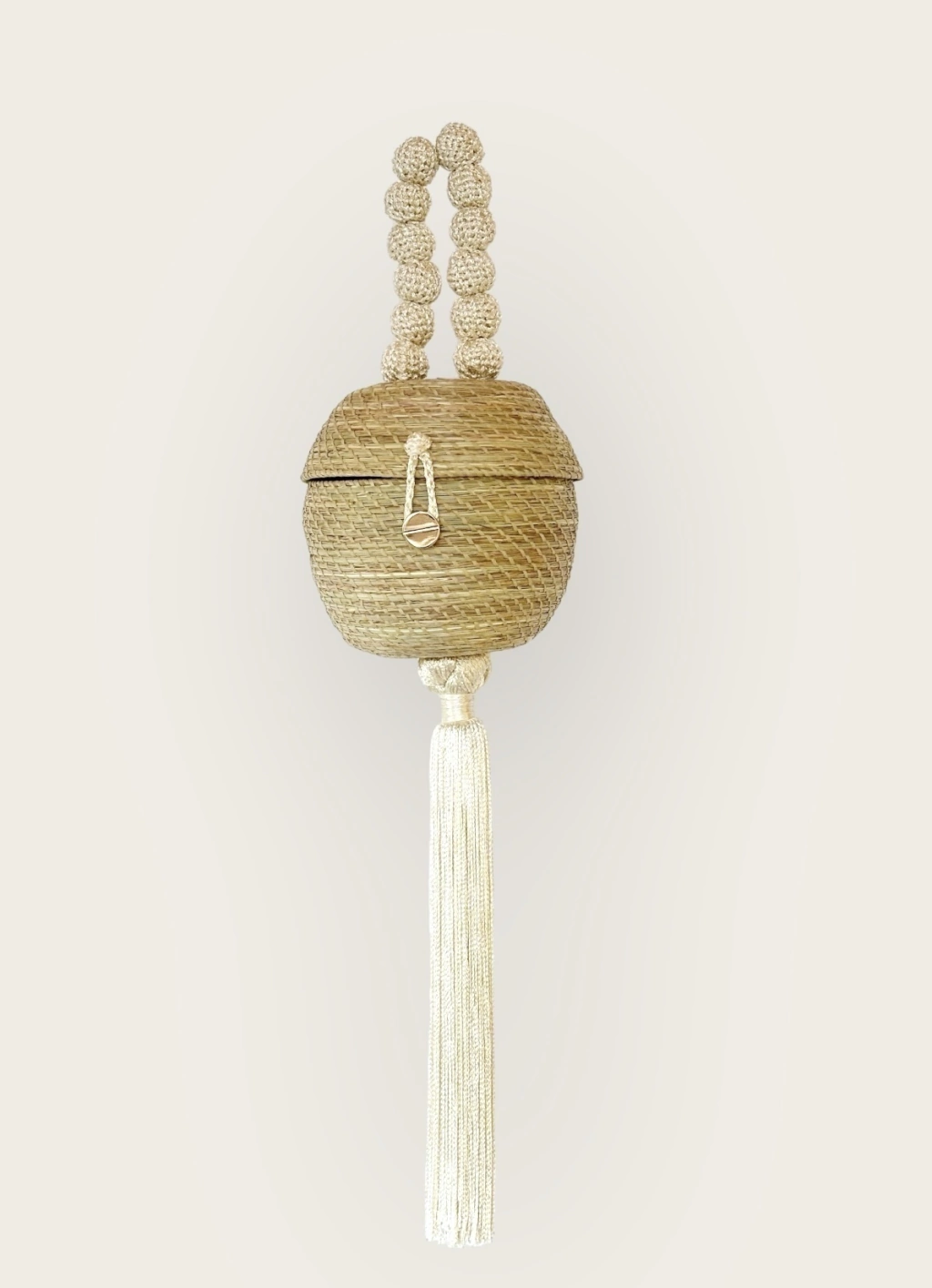 Baulito realizado en espartillo con cierre en metal dorado. Asa corta tejida.