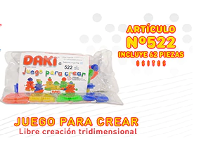 Daki, con su original sistema de encastre, permite unir las piezas en todas las direcciones, logrando así crear las formas deseadas, aún las más insólitas.Daki por su material y densidad, permite armar modelos que floten en el agua.Daki puede lavarse en agua hirviendo sin ninguna dificultad.