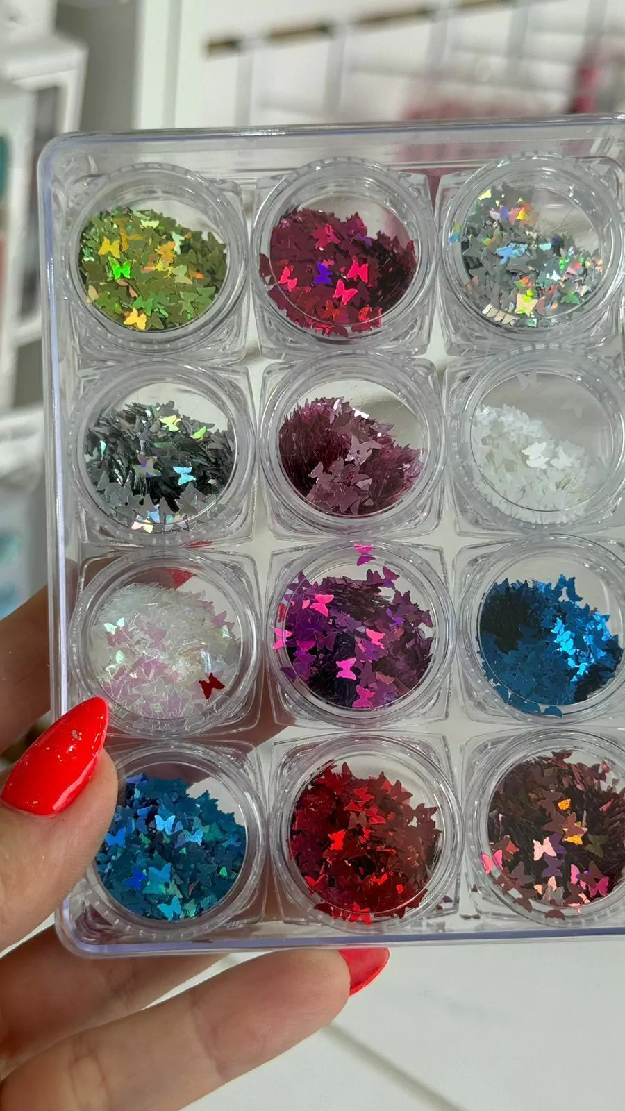 Glitter con diferentes formitas, set de decoración para uñas. Contiene 12 unidades.