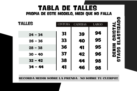 *Las medidas del jean no contempla la elasticidad del mismo, si estás entre 2 talles, te sugerimos elegir el más chico ya que seden como todo jeans con el mismo uso diario*