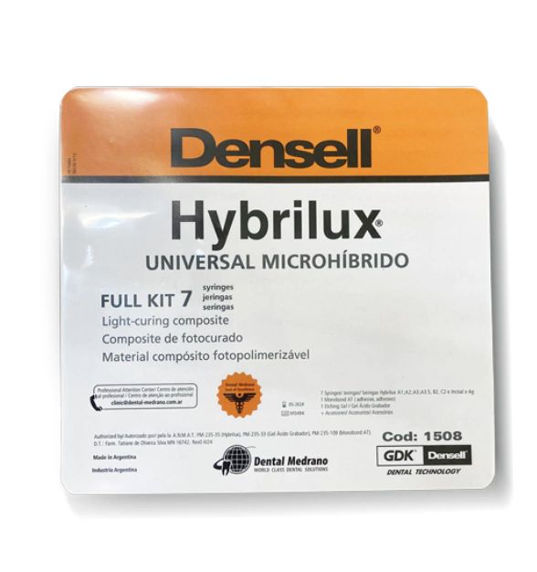 HYBRILUX FULL KIT 7 Jering.-Microhibrido UniversalCód. 1508$74.626,64Precio público IVA incluidoEn stockDescripción del producto:Composite de fotocurado de uso universal - Microhíbrido Restaurador versatil anterior posterior. Consistencia de facil aplicación. Capacidad de pulido a alto brillo para una mejor resistencia a la placa bacteriana. Material con alto nivel de carga y excelentes propiedades físicas. Su baja absorción de agua asegura estabilidad de color y de sus propiedades fisicas por un largo periodo de tiempo. USO: Anterior/Posterior Restauraciones Clase I a V Carillas veeners directas VENTAJAS: Alta resistencia a la fractura y desgaste. Gran manejo Muy buena adaptación marginal. Gran pulibilidad por sus partículas microfinas. Alta estética con efecto camaleón. Muy radiopaco. No pegajoso. Presentación: 7 jeringas Hybrilux colores: A1-A2-A3-A35-Incisal-B2- C2 1 Adhesivo MONOBOND ET cod.1543 (opción principal) o MONOBOND AT cod.1545 (segun stock) 1 Etching Gel Marca : DENSELL