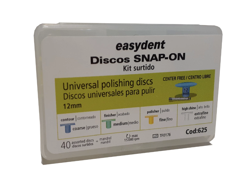 Descripción del producto:Discos de pulido flexiblesTipo shofu snap-on - en cuatro grosores para pulir todo tipo de materiales dentales-Diámetro 12mm-El centro del disco cubre el mandril de manera de facilitar su uso y evitar roce.-Tipo de grano grueso-medio - fino- superfinoPresentación: 40 discos (10 de cada grosor + 1 mandril)Marca: EASYDENT