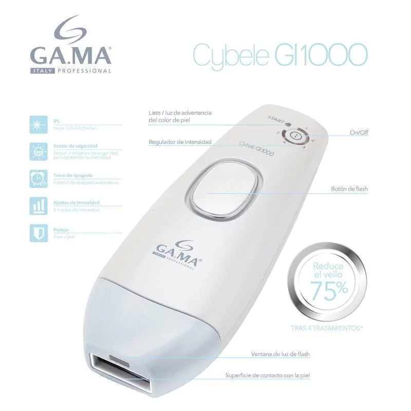 Depiladora de luz pulsada de larga duración. Cybele hace que el momento de la depilacion sea simple, rapido y práctico. Reconoce automáticamente tu tono de piel. Previene el renacimiento del vello corporal y lo elimina de forma permanente. Reduce un 75% el vello tras 4 tratamientos. Posee 5 niveles diferentes de intensidad. Areas de aplicacion: Rostro, Axilas, Brazos, Espalda, Piernas.CYBELE Ademas posee IPL hasta 120.000 flashes, sensor inteligente de seguridad para el control de intensidad, control de apagado automático.